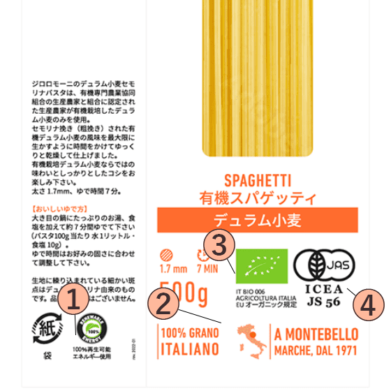 ジロロモーニパスタパッケージには4つのマークが配置されています。