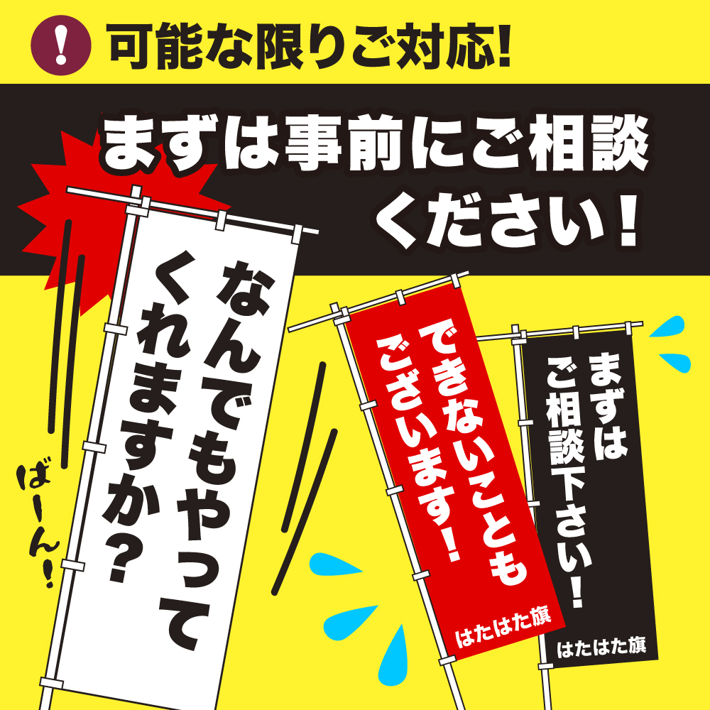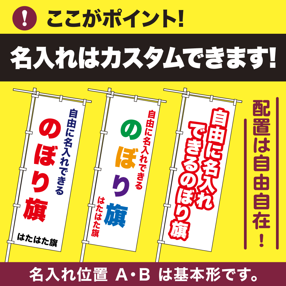 訴求内容や店名や団体名、スローガンなどを名入れできる半オーダーメイド式オリジナルのぼり旗。
