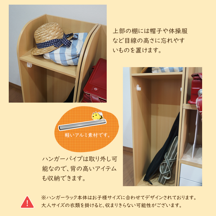 ※ハンガーラック本体はお子様サイズに合わせてデザインされております。大人サイズの衣類を掛けると、収まりきらない可能性がございます。