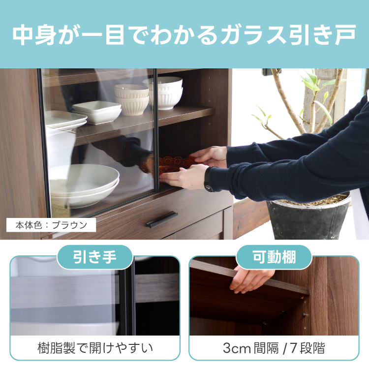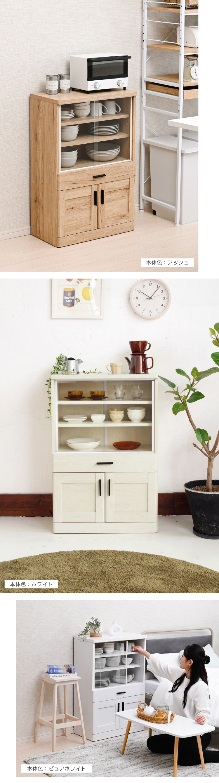 ミニ食器棚 食器棚 一人暮らし 安い 幅60cm ロータイプ スリム カップボード 引き戸 キッチン収納棚 Roundear