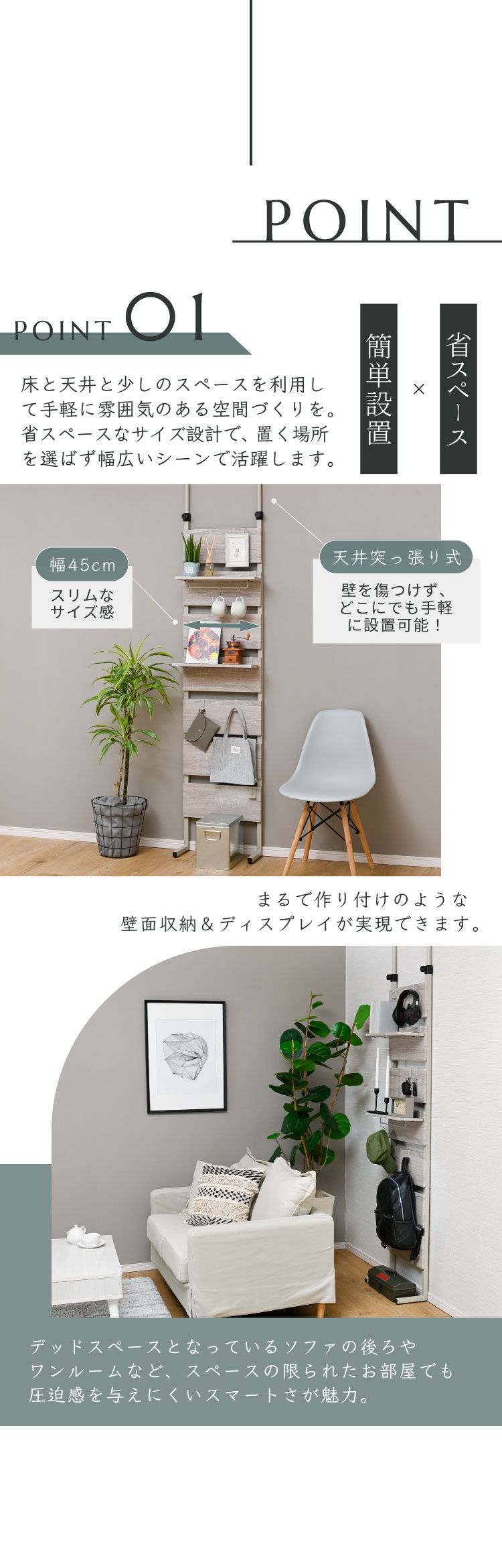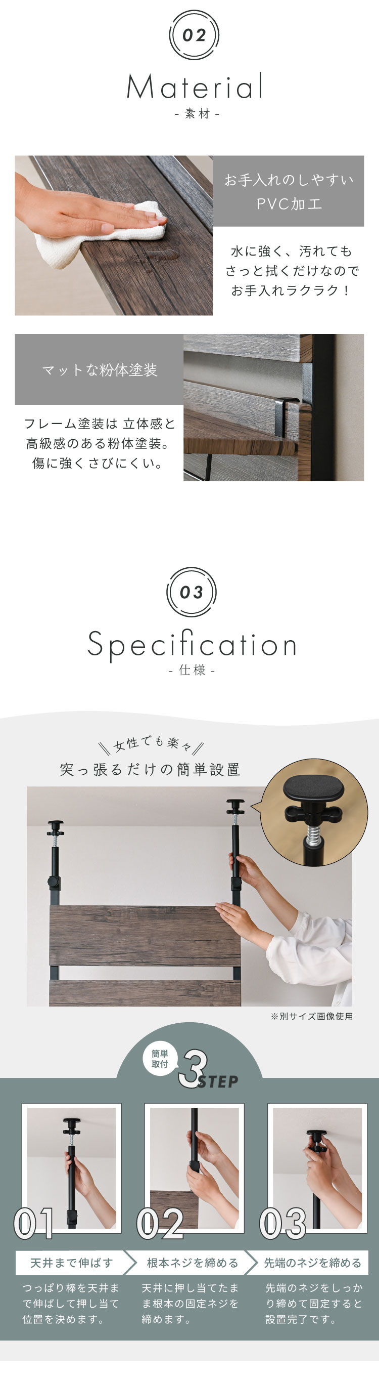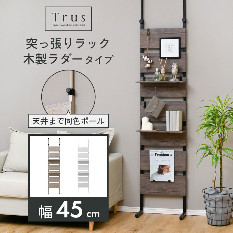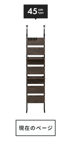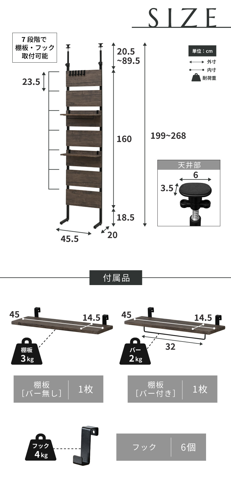 ・本体外寸: 幅約45(突っ張り接続部含む幅約45.5)×奥行約19.5(突っ張り接続部含む奥行約20)×高さ約199〜268cm ・天井接地面:幅約6×奥行約3.5cm ・可動棚内寸:幅約45×奥行約14.5cm ・バー幅:約32cm