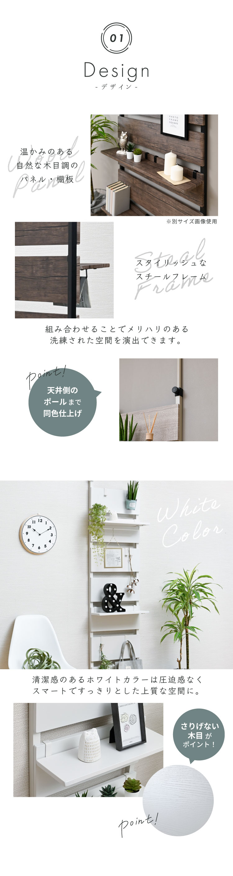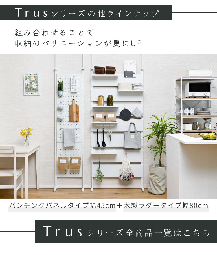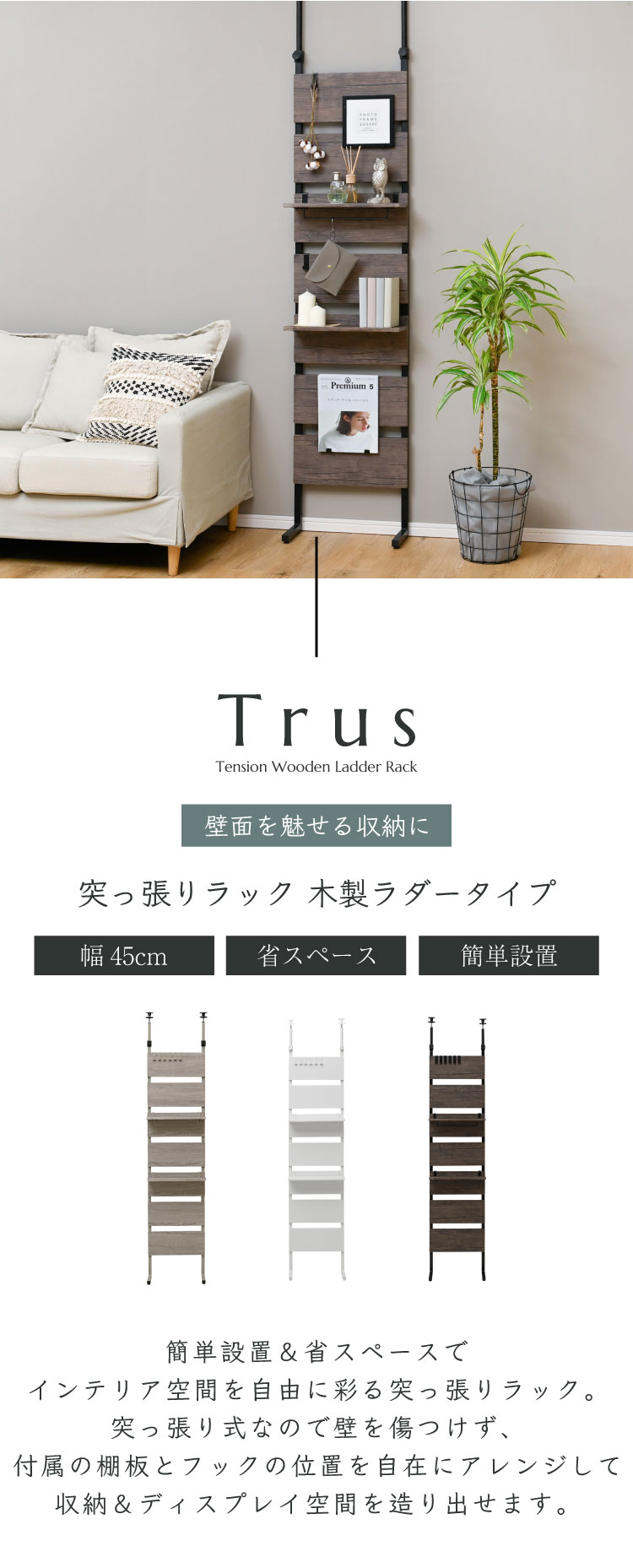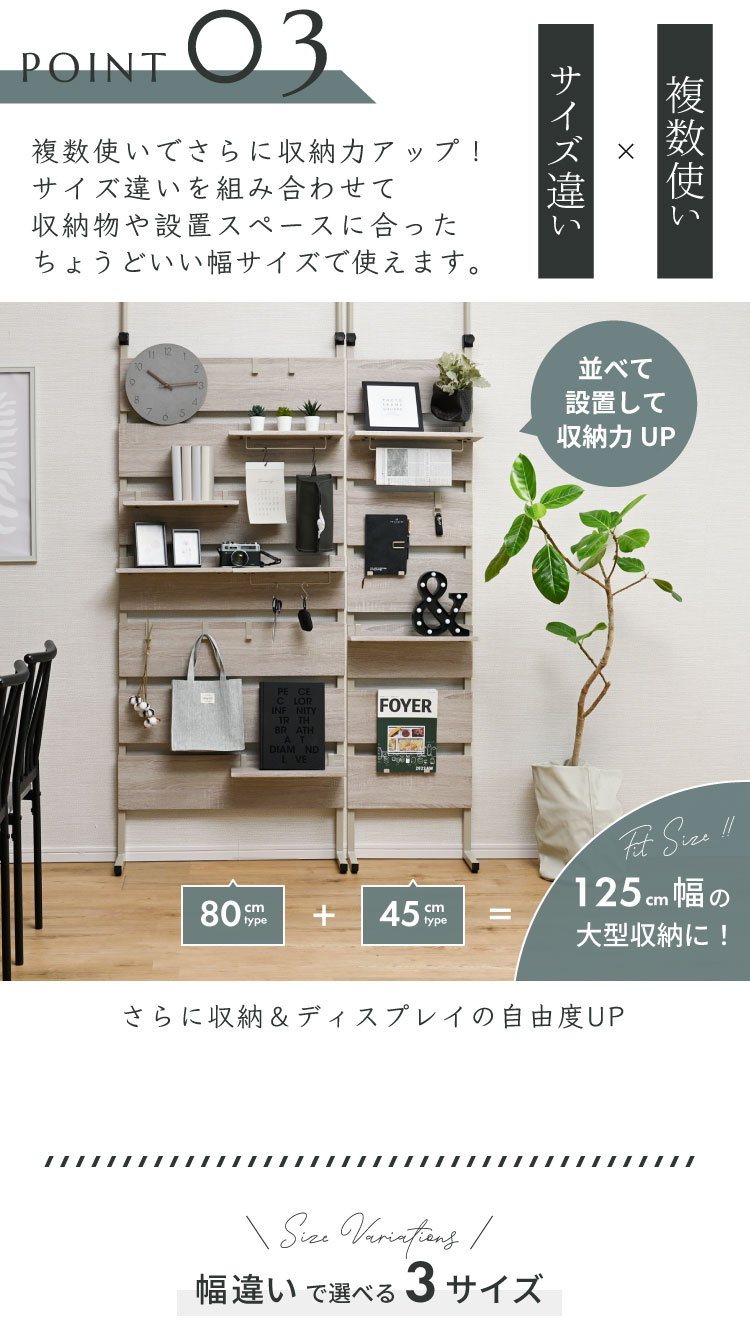 ・本体外寸: 幅約45(突っ張り接続部含む幅約45.5)×奥行約19.5(突っ張り接続部含む奥行約20)×高さ約199〜268cm ・天井接地面:幅約6×奥行約3.5cm ・可動棚内寸:幅約45×奥行約14.5cm ・バー幅:約32cm
