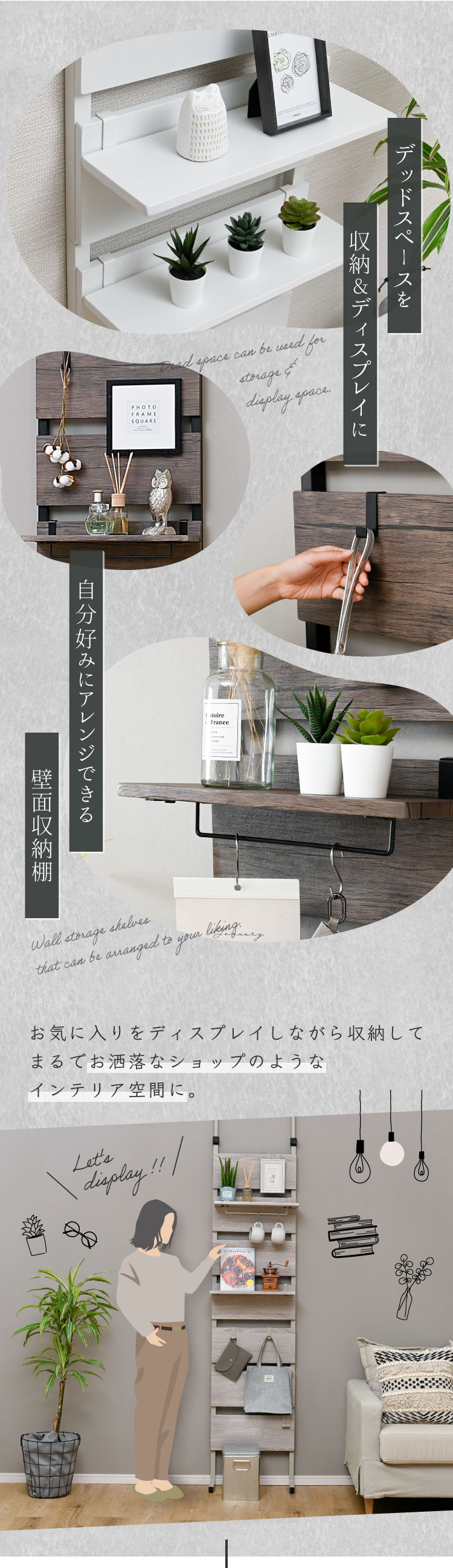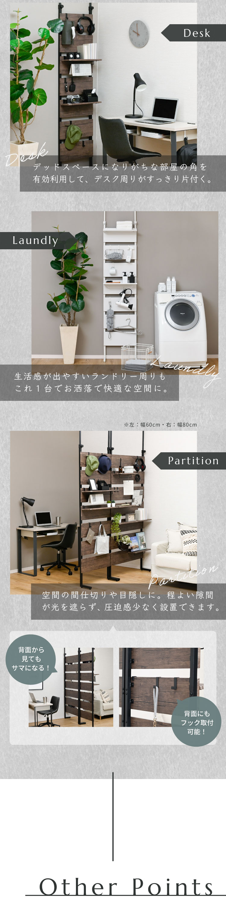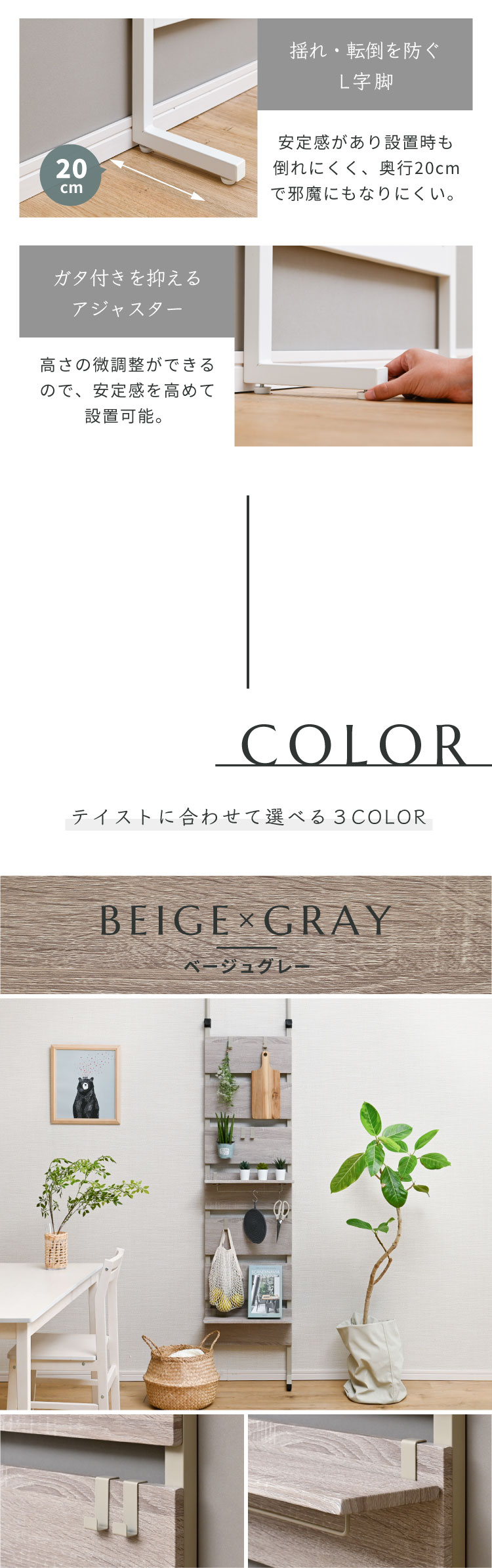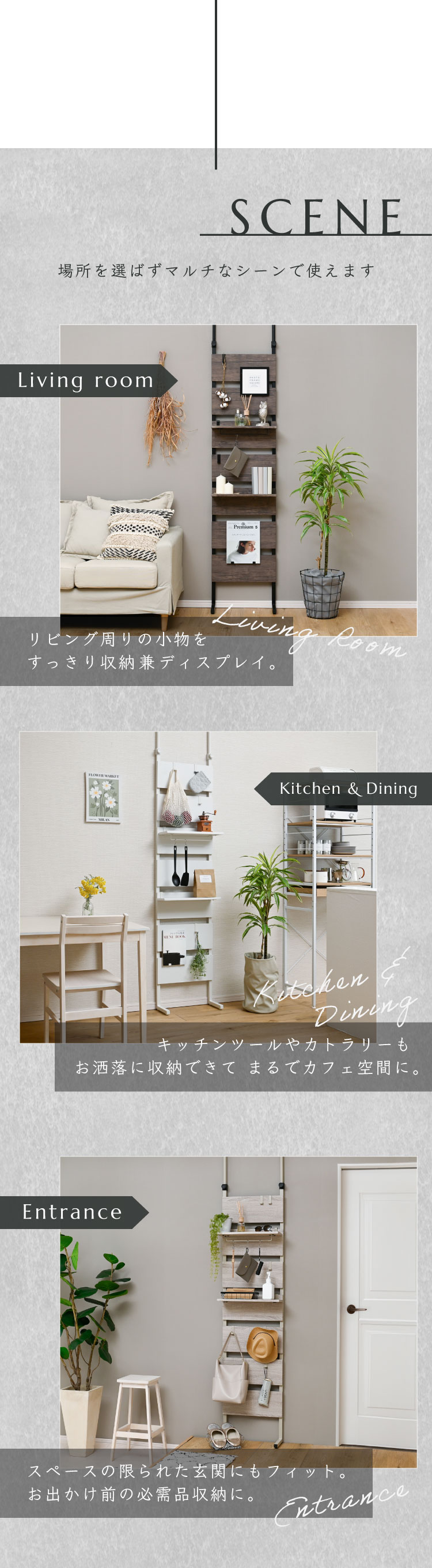 ・本体外寸: 幅約45(突っ張り接続部含む幅約45.5)×奥行約19.5(突っ張り接続部含む奥行約20)×高さ約199〜268cm ・天井接地面:幅約6×奥行約3.5cm ・可動棚内寸:幅約45×奥行約14.5cm ・バー幅:約32cm