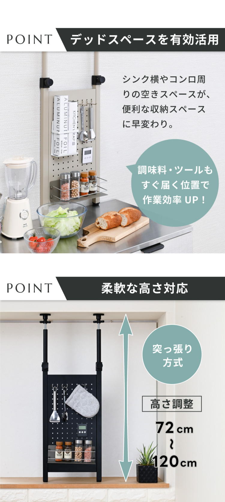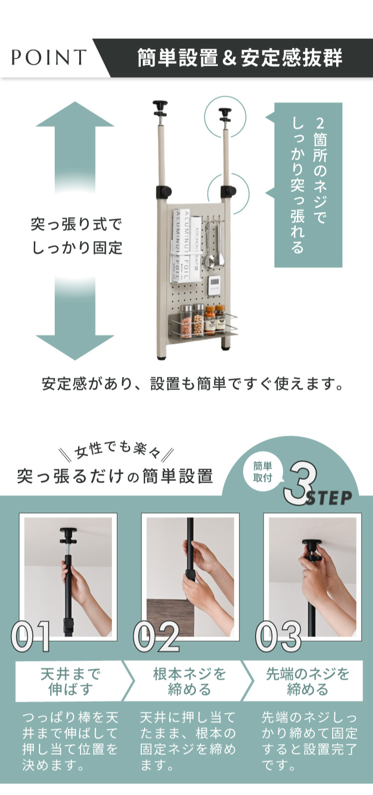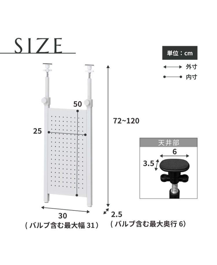 | サイズ | ・本体外寸: 幅約30(突っ張り接続部含む幅約31)×奥行約2.5(突っ張り接続部含む奥行約6)×高さ約72〜120cm |