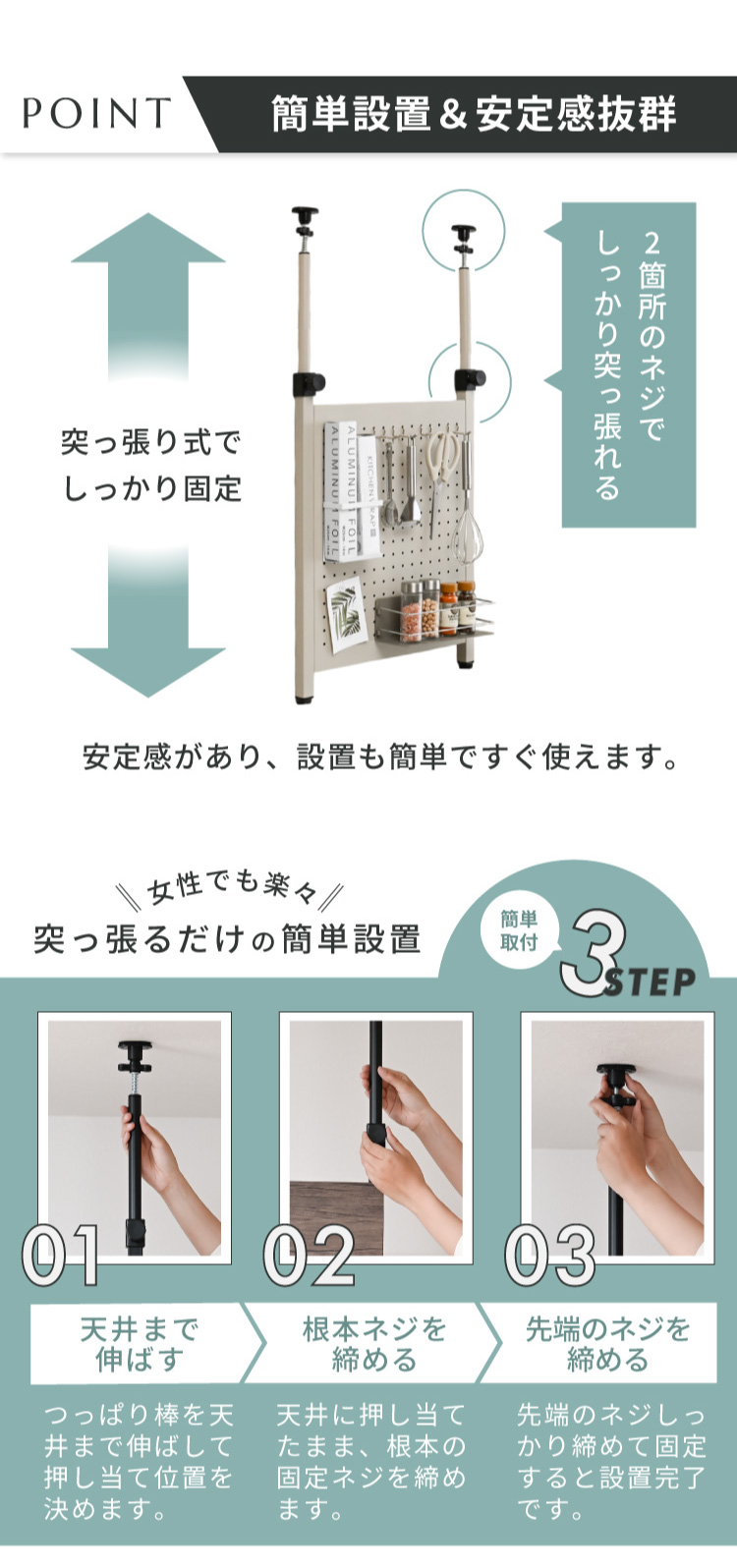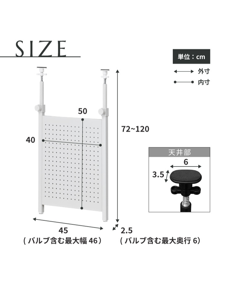 | サイズ | ・本体外寸: 幅約45(突っ張り接続部含む幅約46)×奥行約2.5(突っ張り接続部含む奥行約6)×高さ約72〜120cm |