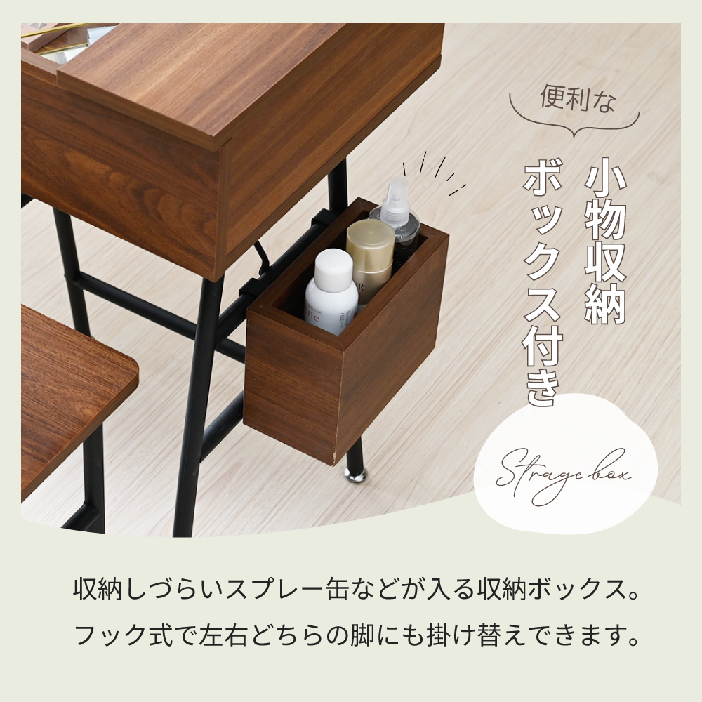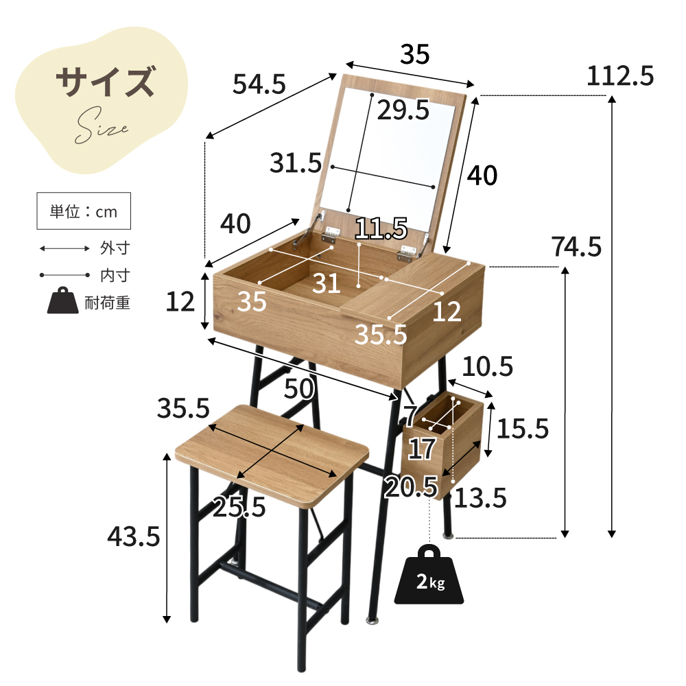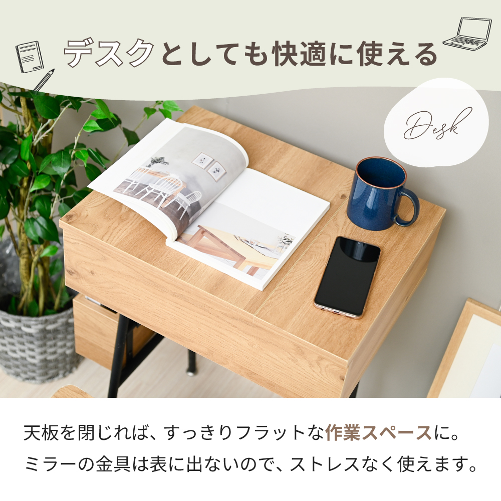 | サイズ | ・本体外寸:幅約50×奥行約40(ミラー天板オープン時約54.5)×高さ約76(ミラー天板オープン時約112.5)cm |