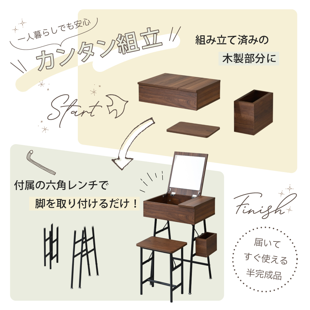 | 備考 | ・半完成品。ドレッサー脚、スツール脚、サイドボックスフックのみお客様組み立てです。付属の六角レンチをご使用下さい。 ・実際の商品の色にできるだけ近づけるよう撮影を行っておりますが、お使いのモニターによって商品の明るさや色が多少異なって見える場合がございます。 ・配送料金は地域により異なる場合があります。 ・商品の仕様は予告なく変更になる場合があります。 ・本商品は当店オリジナル商品です。 |