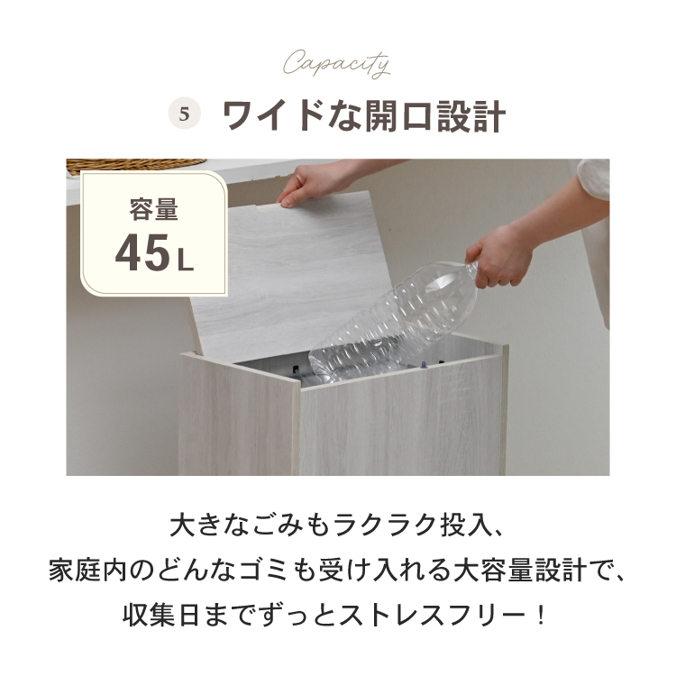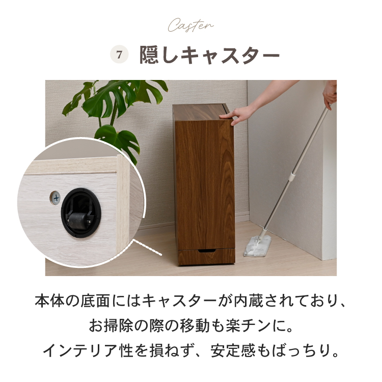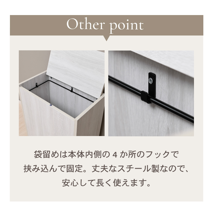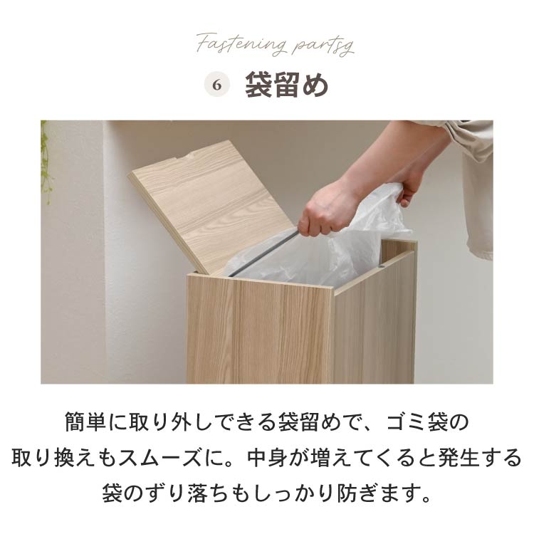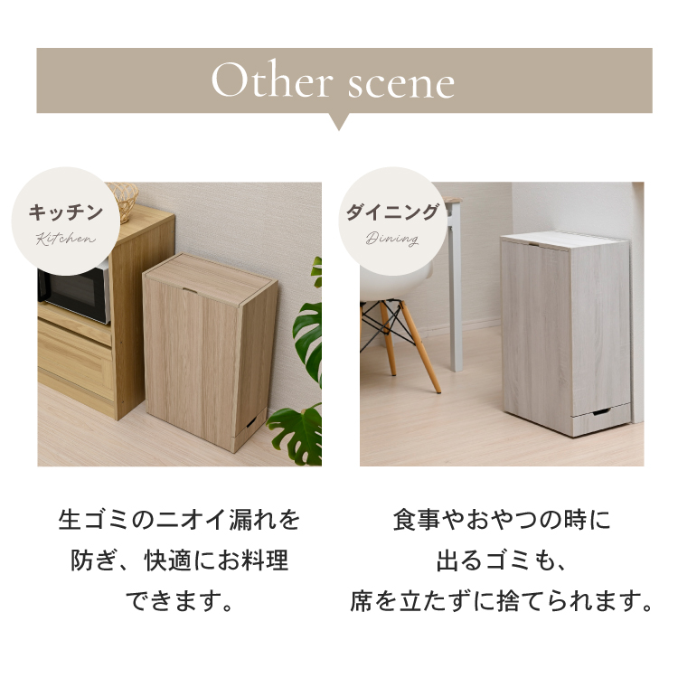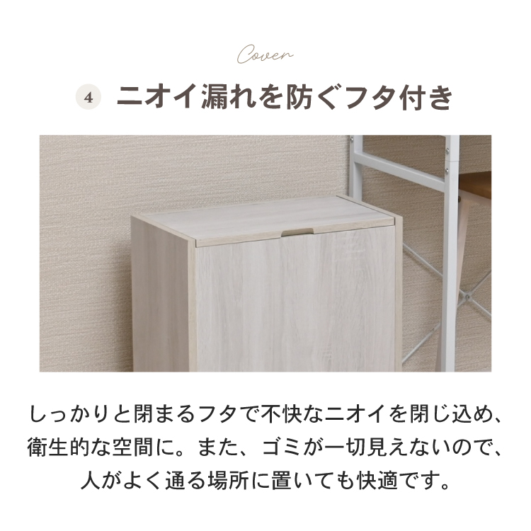| サイズ | ・本体外寸:幅約26奥行約45×高さ約68(蓋オープン時85.5)cm ・ゴミ箱内寸:幅約22.5×奥行約41.5×高さ約50.5(最大56)cm ・引き出し内寸:幅約17×奥行約38.5×高さ約3(最大3.5)cm |