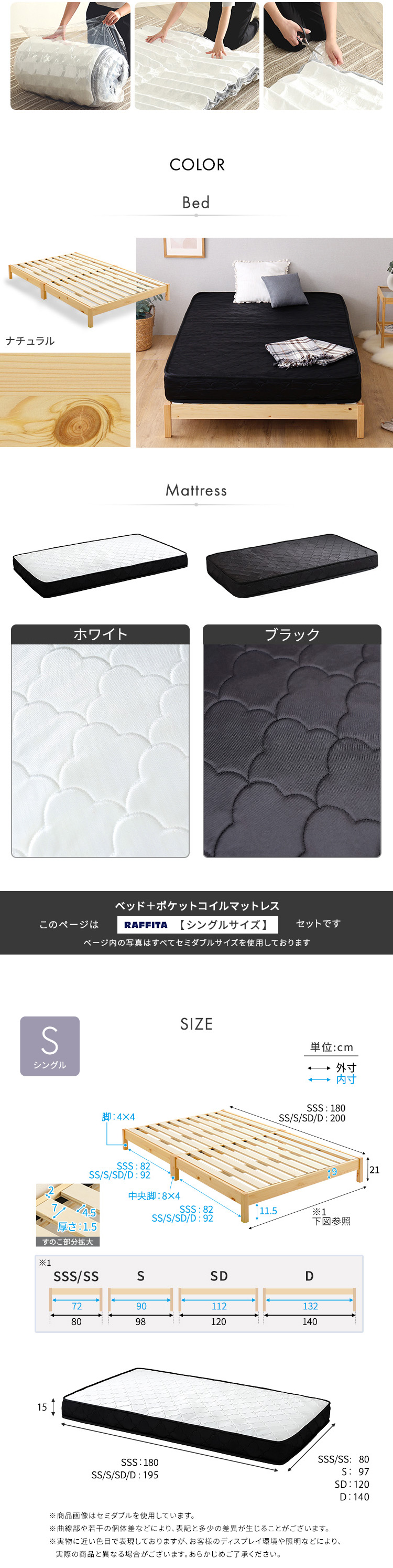 2分で完成 組立簡単ベッド ポケットコイル マットレス付き シングル ロータイプ 木製 すのこベッド 宮無し 脚付きベッド シンプル シングルベッド