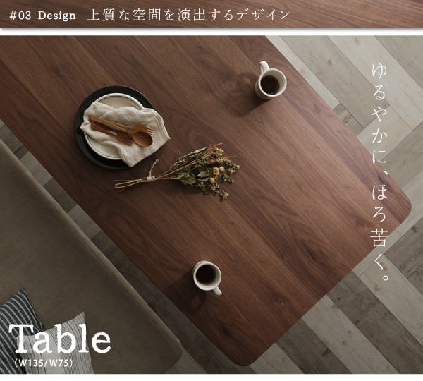 4点セット(テーブルW135 + 2Pソファ×1 + 1Pソファ×2)4点セット(テーブルW135 + 1Pソファ×2 + ベンチ×2)5点セット(テーブルW135 + 1Pソファ×4)3点セット(テーブルW135 + 2Pソファ×1 + ベンチ×1)3点セット(テーブルW75 + 1Pソファ×2)ダイニングこたつテーブルW75ダイニングこたつテーブルW135ダイニングソファ1Pダイニングソファ2Pベンチ2P■テーブル(W135cm)