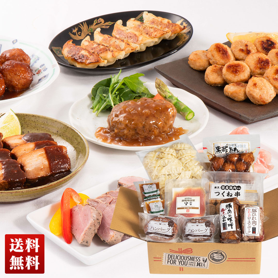 | 内容量 | 国産野菜とお肉の餃子360g、ハンバーグ130g×2、和風シャリアピンソース40g×2、豚ひれ肉のローストポーク100g、黒酢たれ肉だんご300g、つくね串210g、豚肉の味噌煮込み210g、ロース生ハムスライス67g |