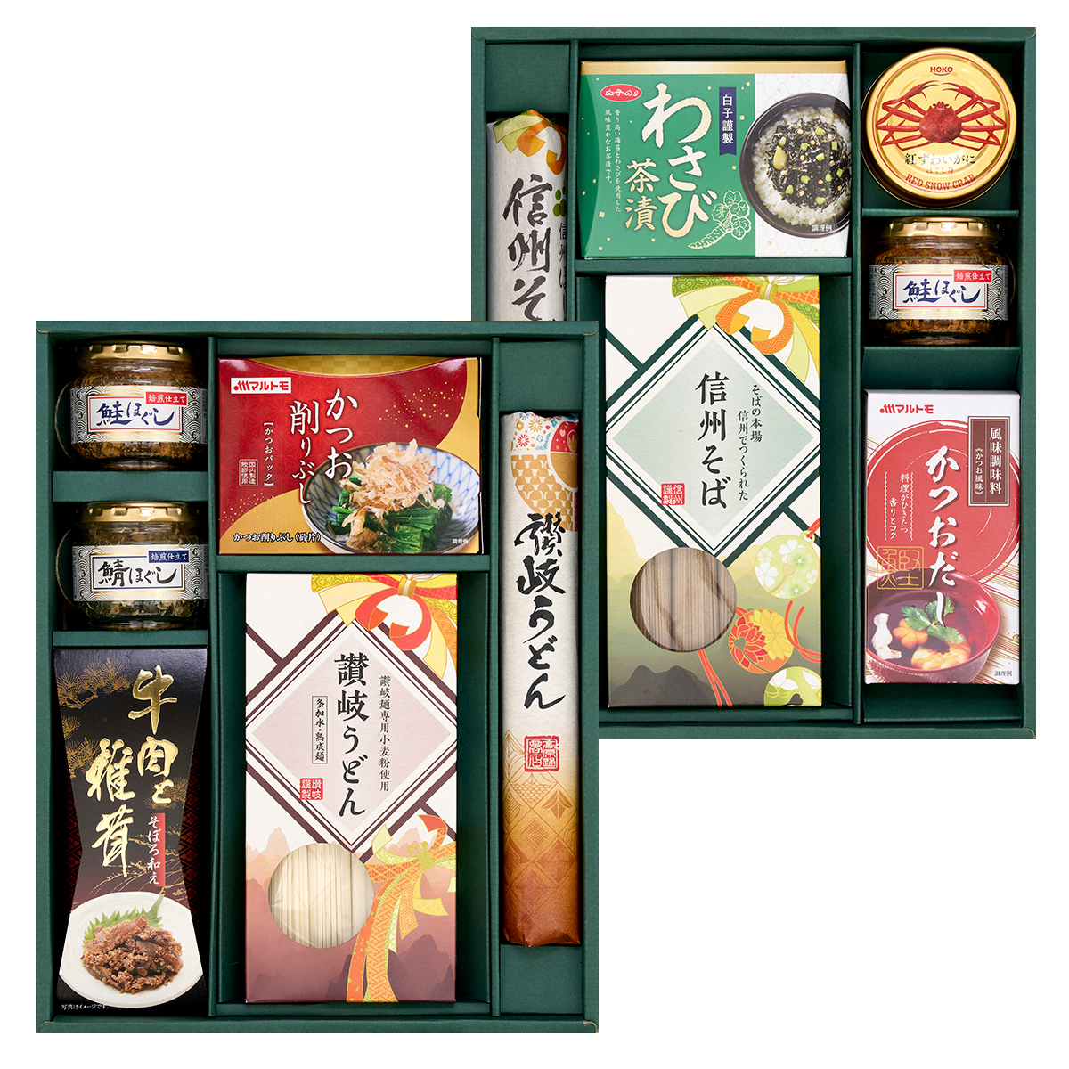 | 内容量 | 讃岐うどん(320g・180g)、信州そば(280g・180g)、牛肉と椎茸のそぼろ和え55g、紅ずわいがにほぐし身55g、鮭ほぐし40g×2、鯖ほぐし40g、白子のりわさび茶漬3.3g×3袋、マルトモ(かつお削りぶし(1.5g×4袋)・かつおだし(8g×5袋)) |