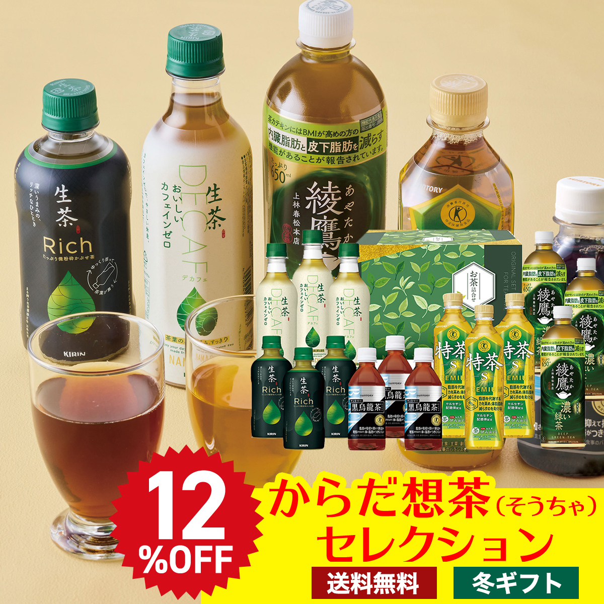 | 内容量 | サントリー(黒烏龍茶350ml・特茶500ml)×各3、キリン(生茶リッチ400ml・生茶おいしいカフェインゼロ430ml)×各3、日本コカ・コーラ綾鷹濃い緑茶650ml×3 |