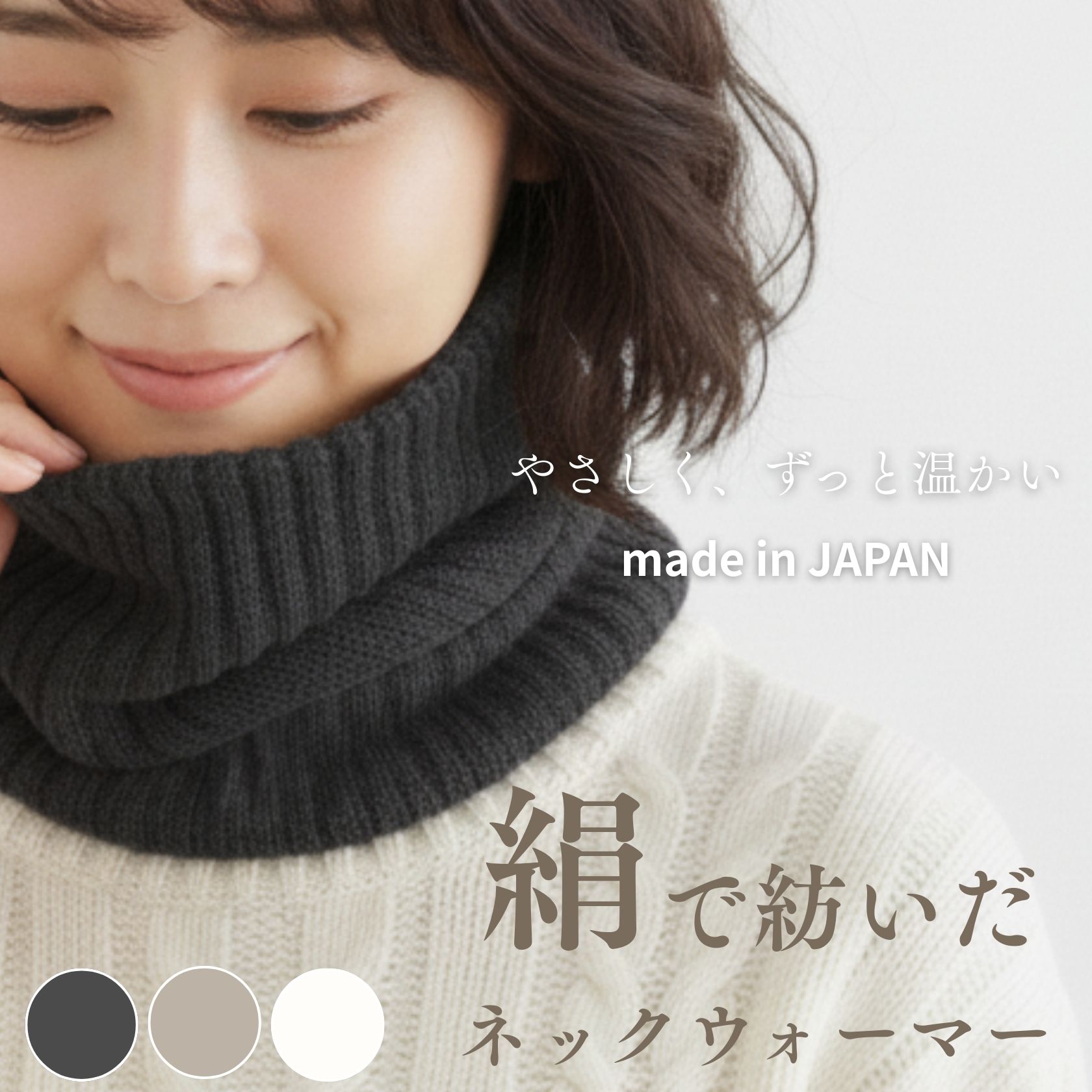 外側は綿100%、内側はシルク100%で仕立てた、肌にやさしい二重構造のネックウォーマーです。