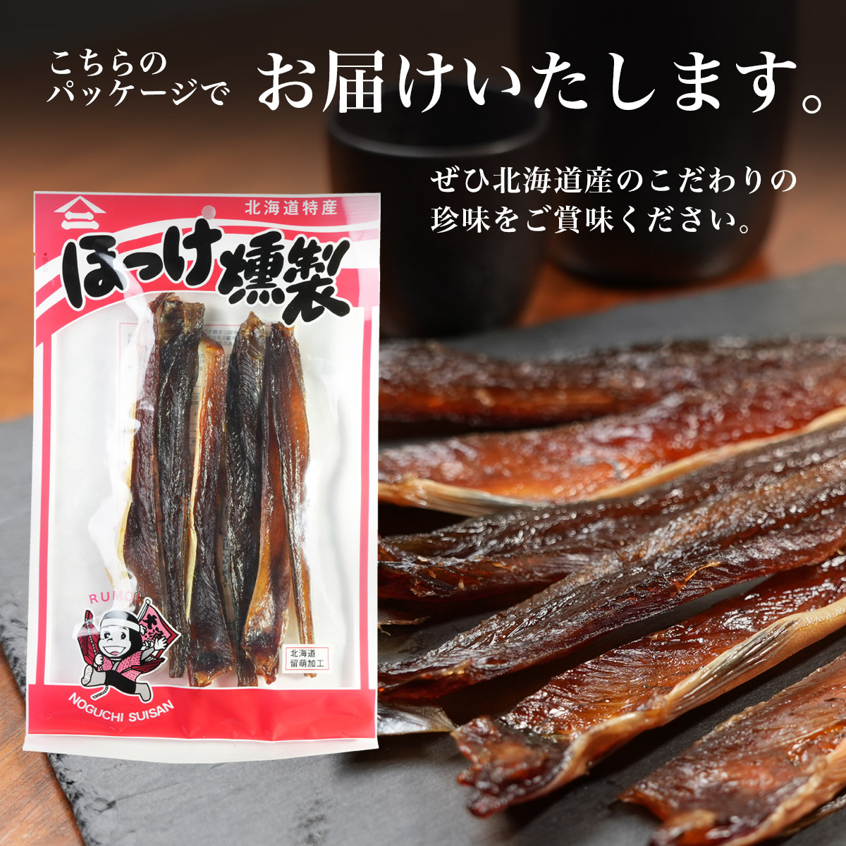 北海道で「やん衆」と呼ばれる漁に雇われ働く男たちが、魚を引き上げる時の威勢の良いかけ声「どすこほい」をイメージしてつくられた、浜ならではの味覚です。 皮がむいてあるので、そのままお召し上がれます。噛めば噛むほど深みが増す薫製の旨味。