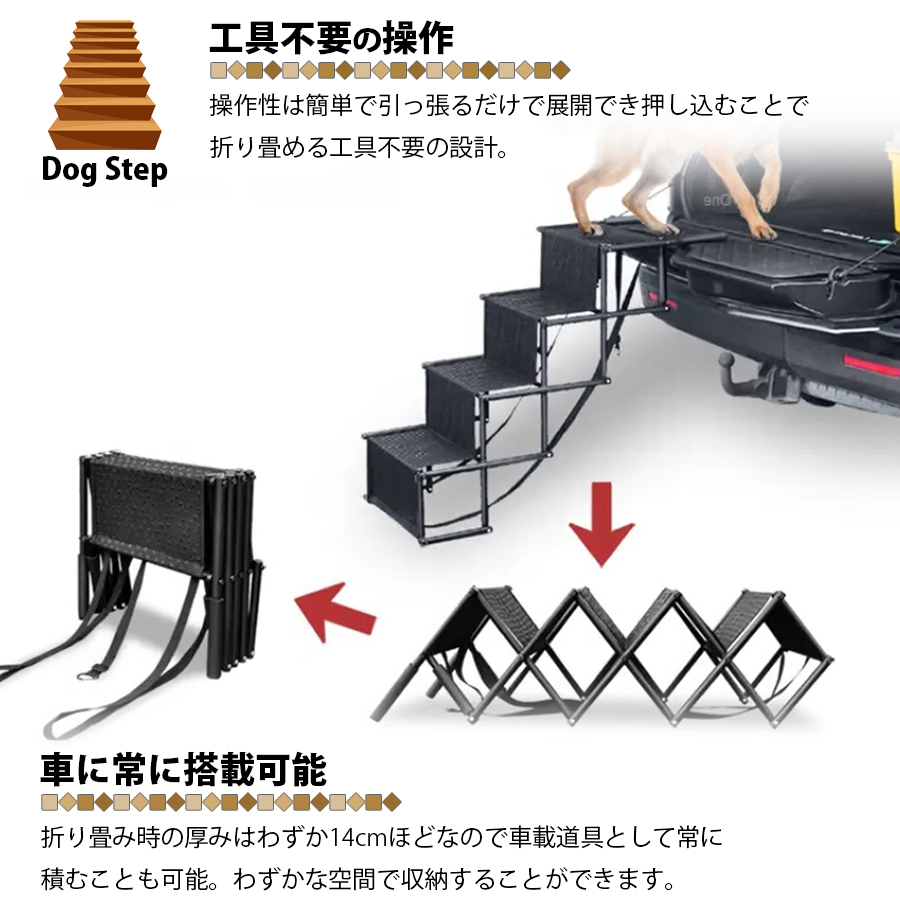 旅行 車載ステップ 踏み台 後部座席 ラゲッジルーム バックドア 昇り降り 4段 折り畳み 補助はしご 段差スロープ 車 乗り降り 遠出 ペット用品 犬用品 車載用ドッグステップ 簡単設置 丈夫 コンパクト 収納 便利グッズ プレゼント 贈り物 ギフト