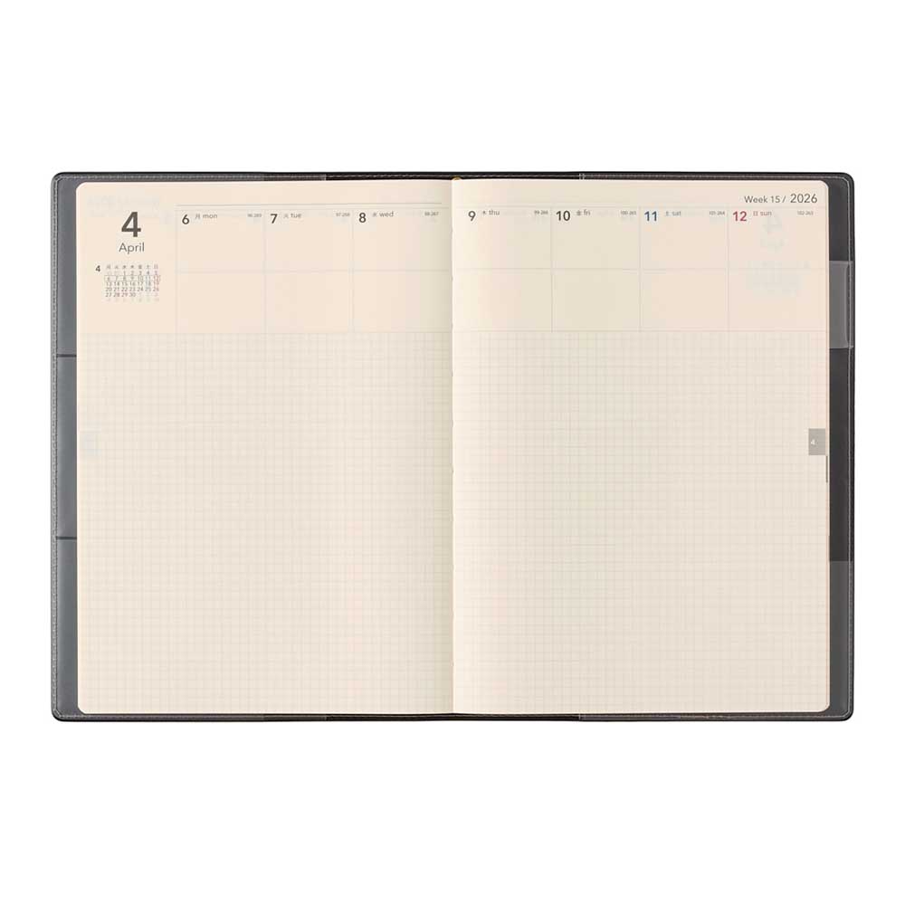 【週間ページ】上部のスケジュール欄(月曜始まり)で予定を把握しながら、たっぷりの方眼メモスペースはノートのように使えます。手帳とノートを一元管理したい方や自由にカスタマイズしたい方におすすめです。