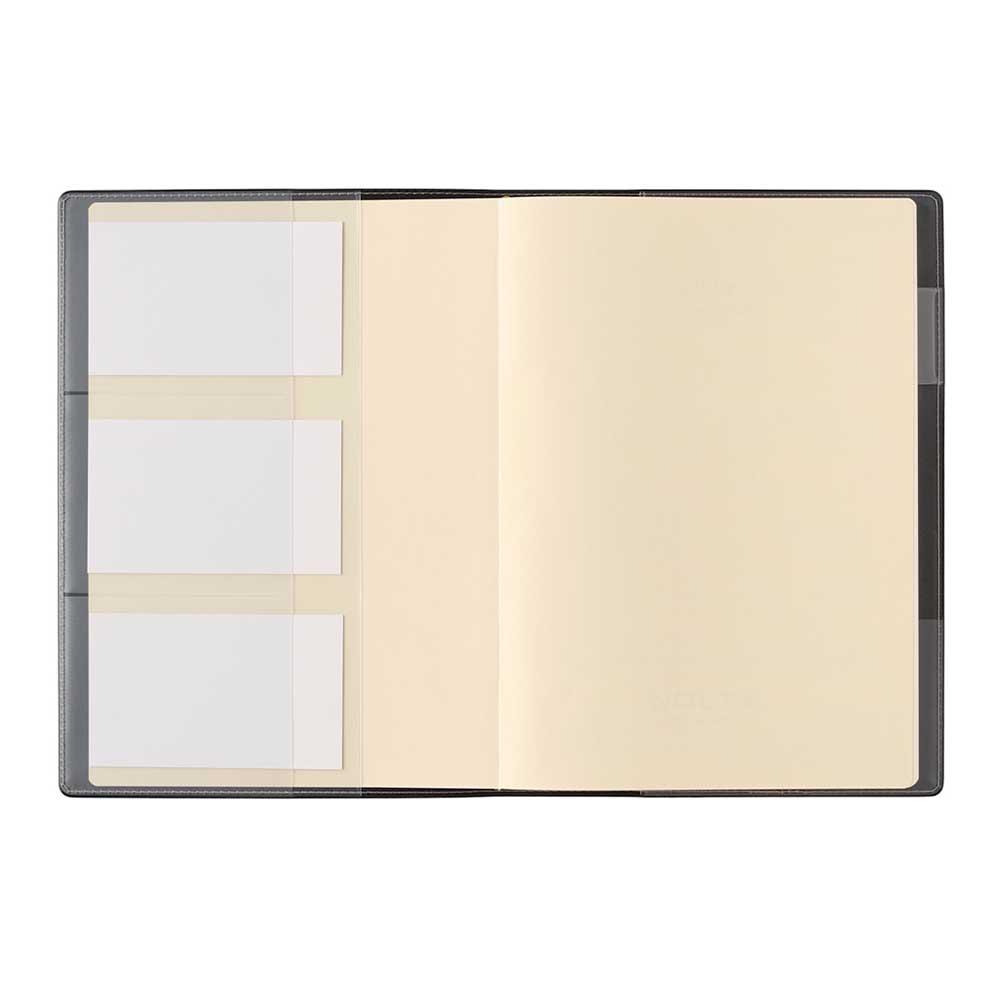 カバー前側には3段名刺ポケット、カバー後ろ側には名刺ポケット・ペンホルダーが付いています。