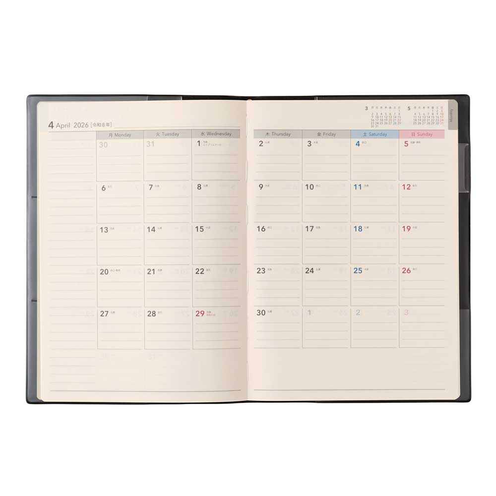 メモページが少なめで月間ページと週間ページがメインの薄型・シンプルなA5サイズ手帳の新商品。