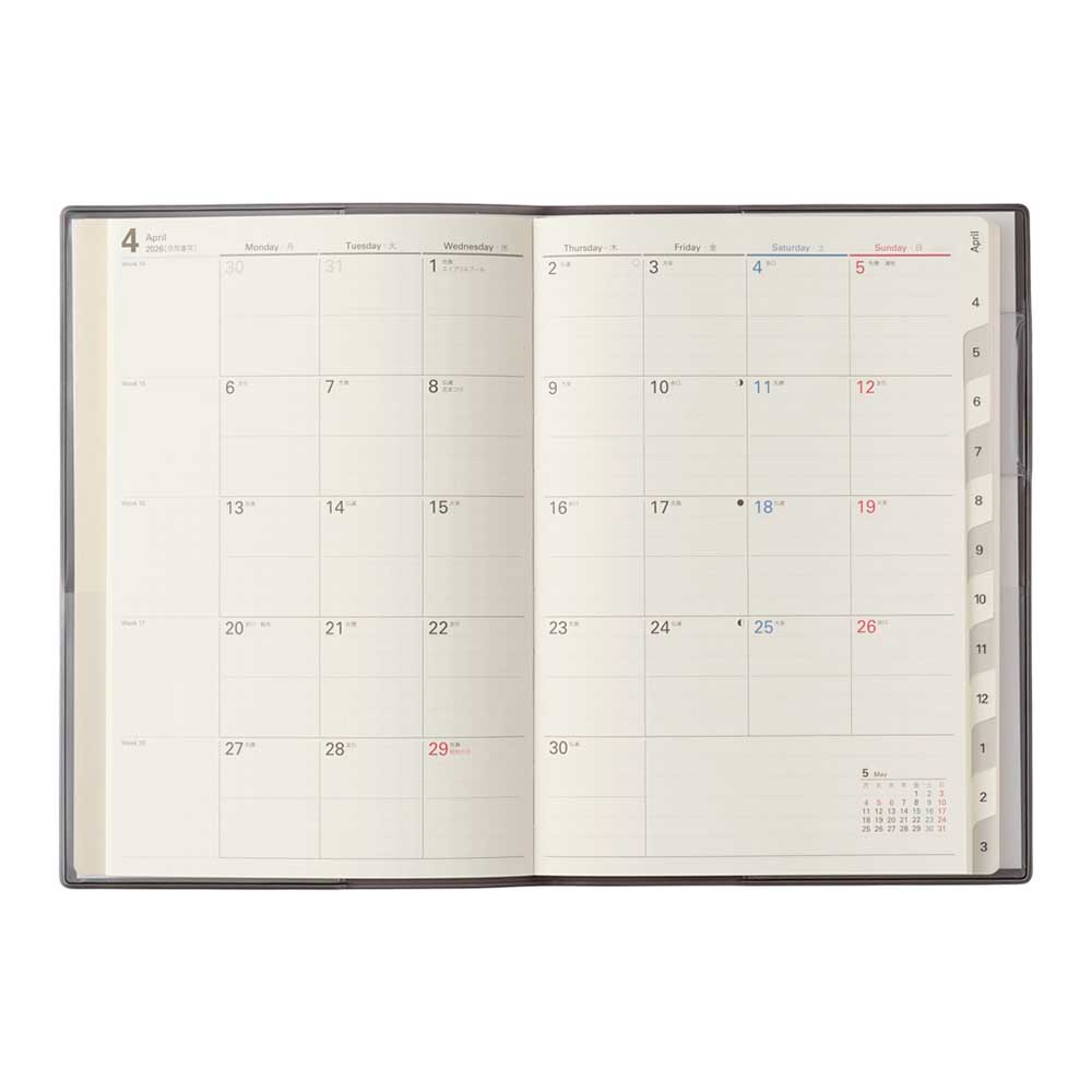 【月間ページ】見開き1ヶ月のベーシックなブロックタイプ(月曜始まり)。