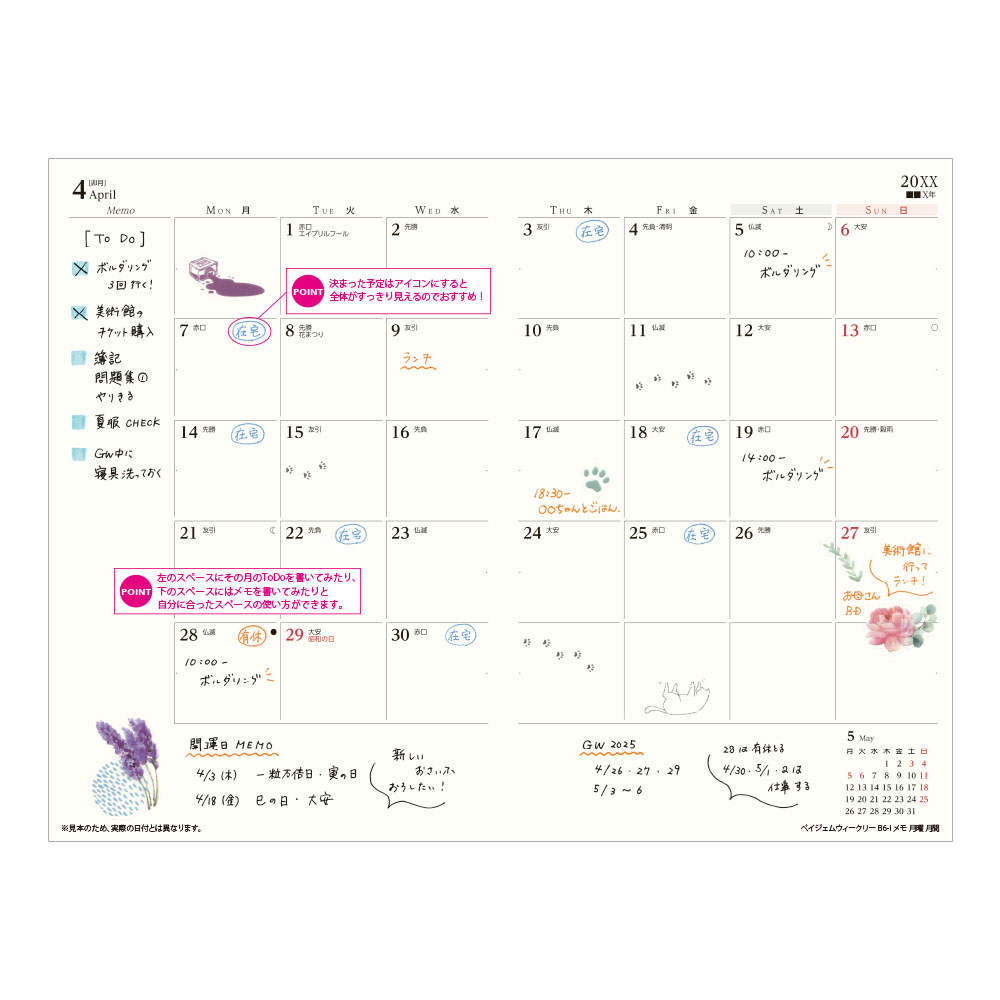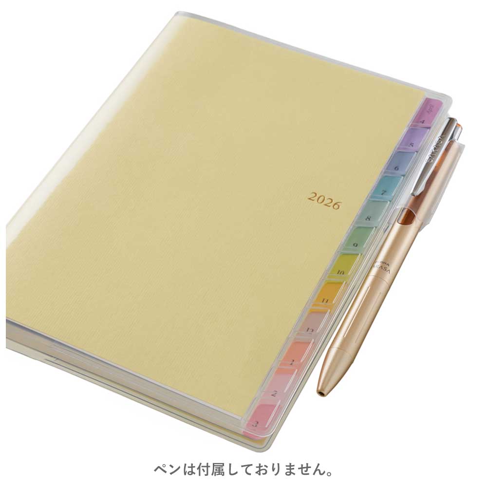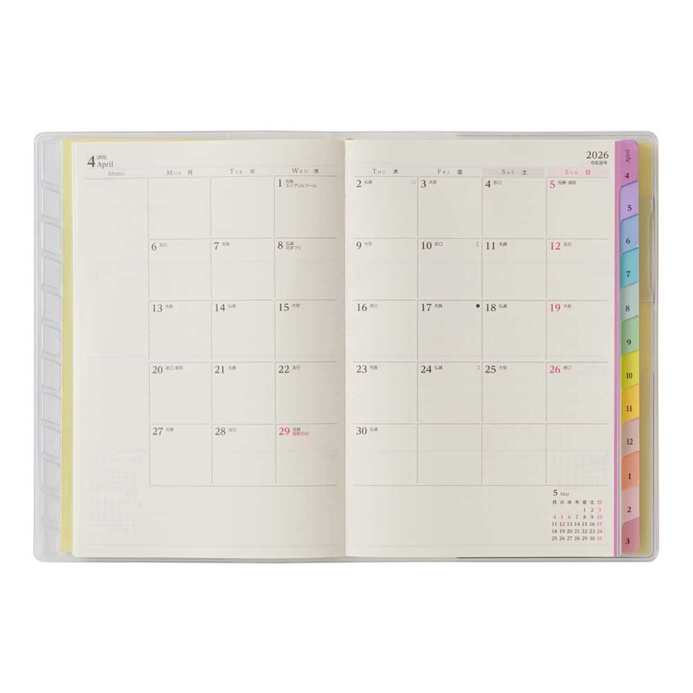 カレンダー感覚で月ごとの予定が把握しやすいのが特徴で、見たいページをパッと開けるインデックス付きです。
