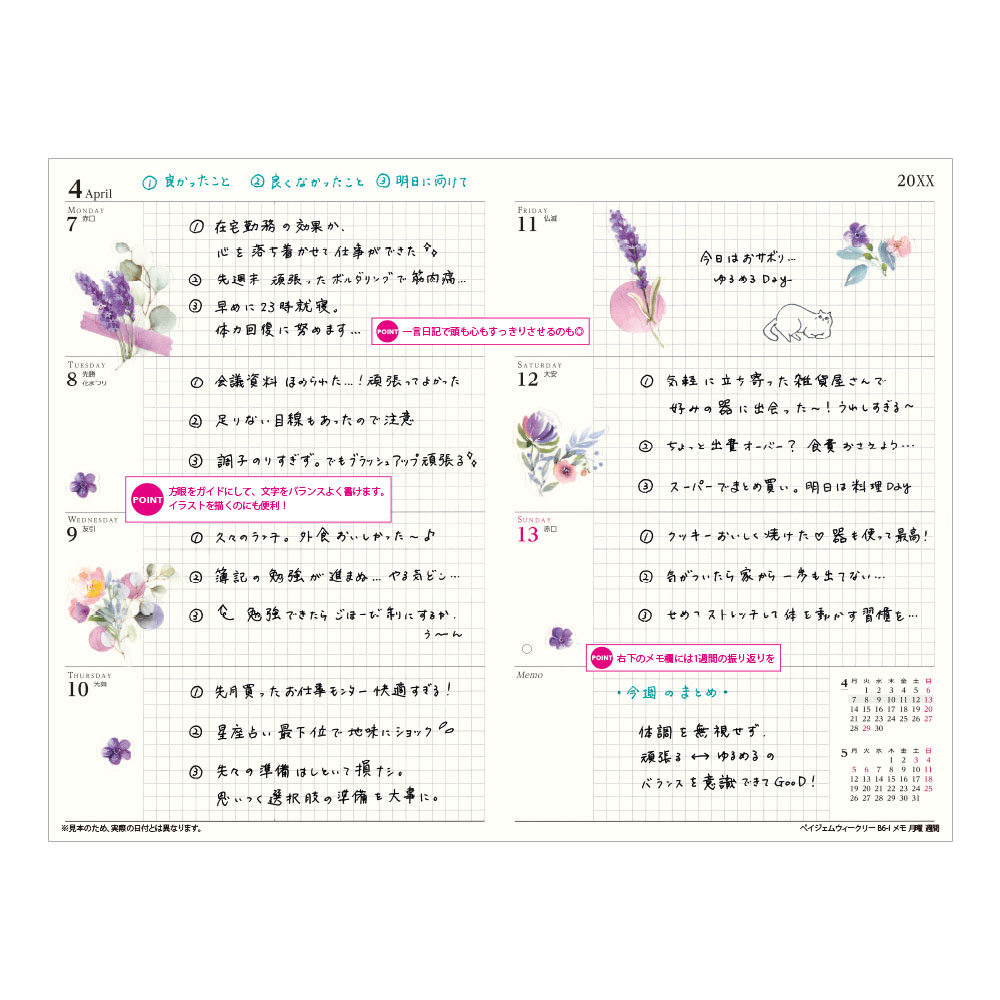週間ページの記入部分が方眼になっているので文字やイラストもかきやすくログにもおすすめ。
