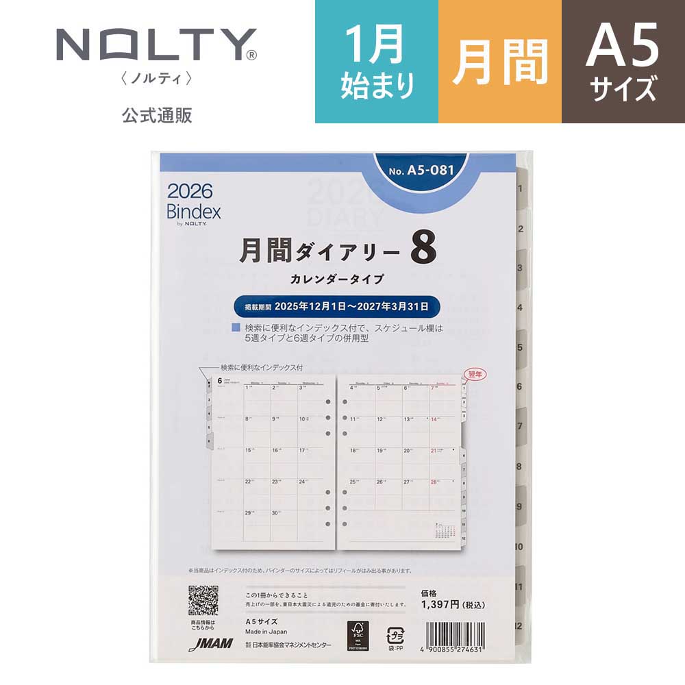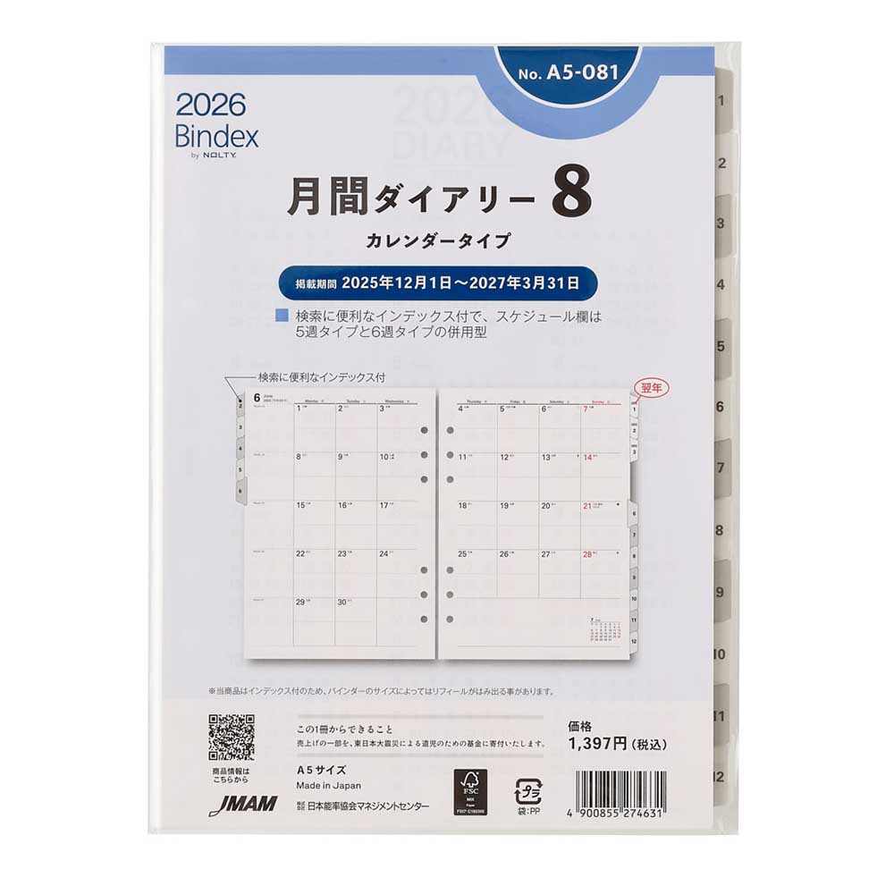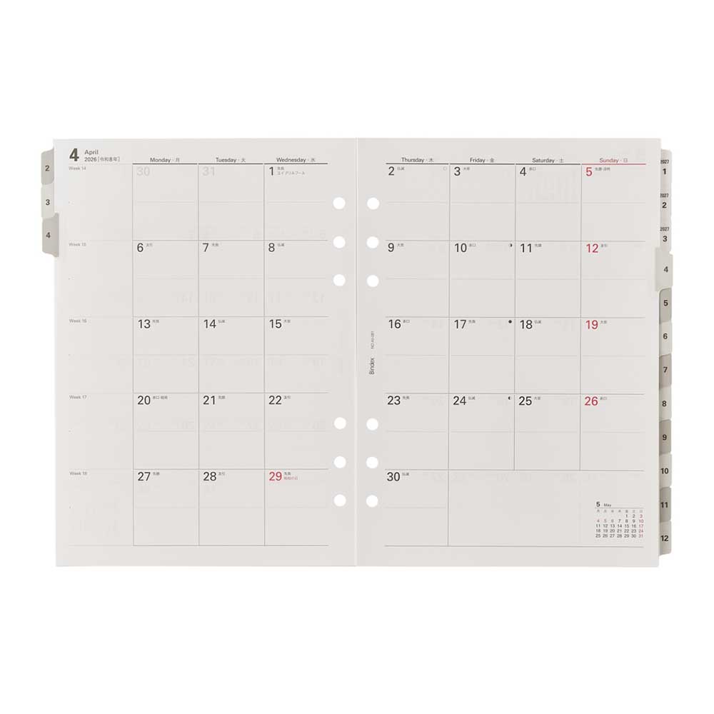 特徴日記欄は5週タイプと6週タイプの併用型システム手帳用リフィル能率手帳の会社がつくるシステム手帳ブランドBindex by NOLTY (バインデックス バイ ノルティ)の新リフィル(A5サイズ)。