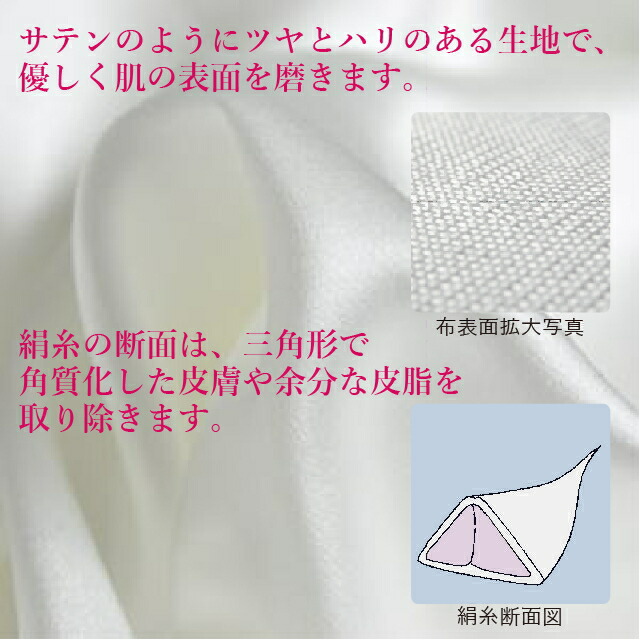 | ◆ 膨らみがあり、弾力性・伸縮性に優れ、独特のシャリ感があります。 ◆ 綿と比較して、30?40%も汗を吸収し、乾燥が早い絹の特徴が活かされています。この優れた吸湿・吸水性で、髪の毛や体の水分をとてもよくとる効果があります。 ◆ 『生きた素材』といわれるシルクは、繊維の中に多くの空気を含み優れた保温性を有します。また柔らかな肌触りがお楽しみいただけます。 ◆ 絹は、人間の皮膚に非常に近いたんぱく質を主成分としており、肌にとてもよくなじみます。また、長期間使用することで、たんぱく質の中のアミノ酸の働きと、三角形の繊維断面が、肌に無理なく角質化した皮膚や余分な脂質をとり除きます。 | |