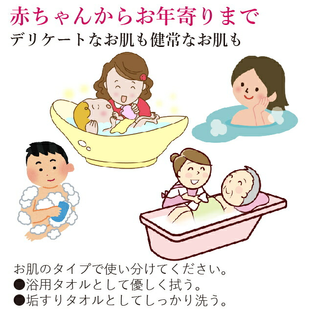 | ◆ このタオルは、身体洗い用です。 ◆ 皮膚の同一箇所をこすりすぎないでください。強くこすらずやわらかくご使用ください。 ◆ 使用後は、水や石鹸をよくきって乾燥させてください。 |