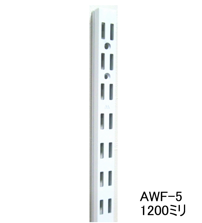 チャンネルサポートASF-1(シングルタイプ)のAホワイトと、耐荷重は同じです。 レールを何本か並べて設置する際、両端はASF-1(Aホワイト)、真ん中はこちらの AWF-5(Aホワイト)を設置すると、ブラケット(棚受け)の設置のパターンが広がります。