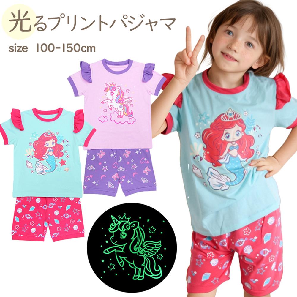 光る プリント パジャマ 半袖 セットアップ 上下セット 子供服 蓄光 女の子 キッズ ジュニア フリル 春 夏 ユニコーン 人魚 メール便