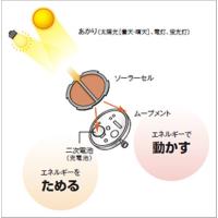 「SOLARMATE」ソーラー電源とは、太陽光だけでなく室内灯などのわずかなあかりを内部に備えたソーラーセルに当て時計を駆動させます。