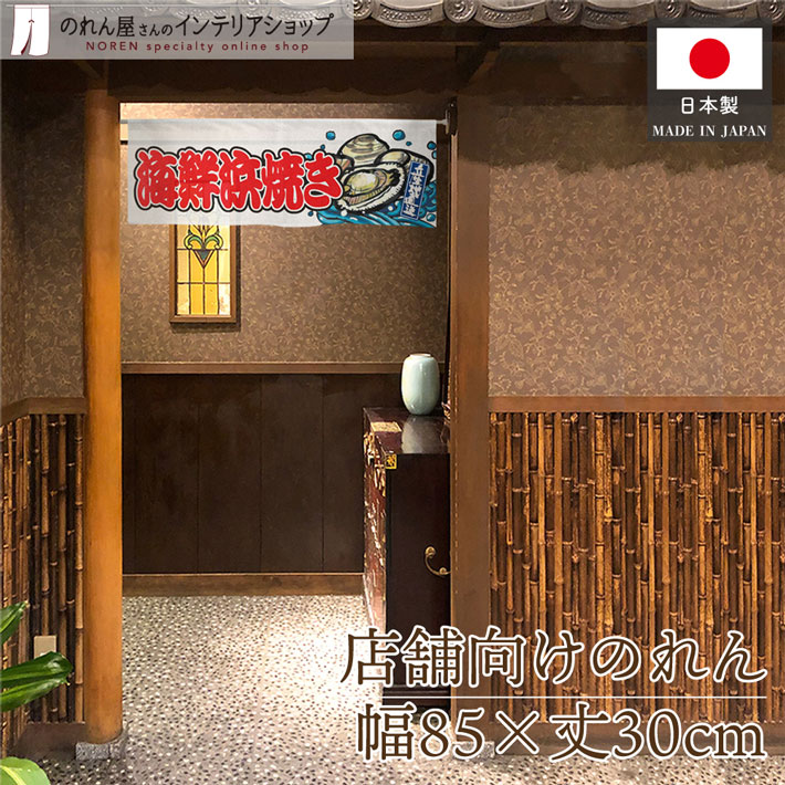 のれん ショート 85cm幅 30cm丈 海鮮浜焼き 波 暖簾 業務用 店舗用 飲食店(受注生産 46490)