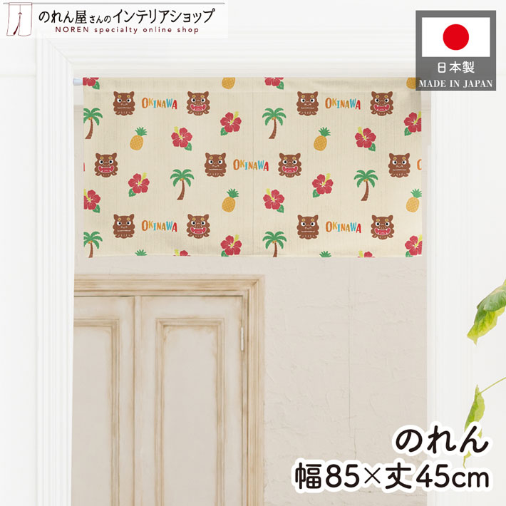 ショート丈 のれん 沖縄 85cm幅 45cm丈 シーサー トロピカル 総柄 琉球 ウチナー 暖簾 間仕切り(受注生産 46955)