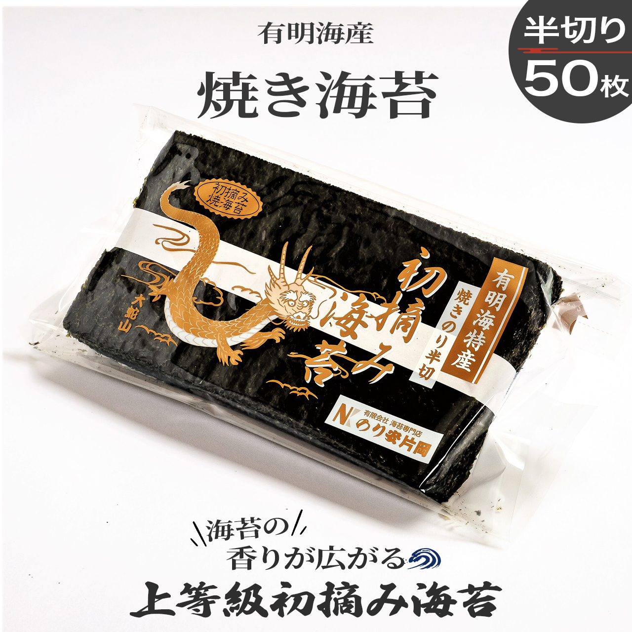 海苔 焼き海苔 有明海産限定 『半切り50枚』 送料無料 乾燥剤付き袋で美味しさ密封 湿気対策もバッチリ 血管若返り食材 ポイント消化 おにぎり手巻きに最適