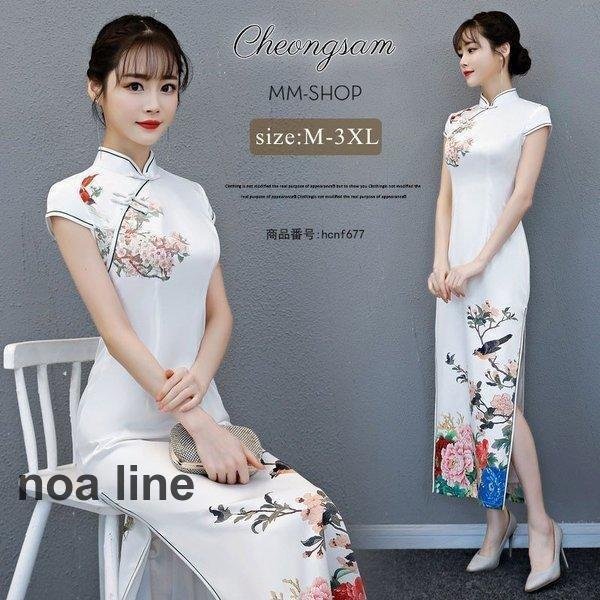 チャイナドレス ロング 半袖 チャイナ風ワンピース チャイナ服 シルク ロングドレス 花柄 スリット 大きいサイズ パーティー ドレス 衣装 中国 Dress