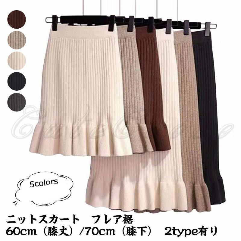 ニットスカート レディース マーメイドスカート 無地 フレア裾 60cm(膝丈)/70cm(膝下) ボトムス カジュアル ハイウェスト 美脚 春秋冬 おしゃれ