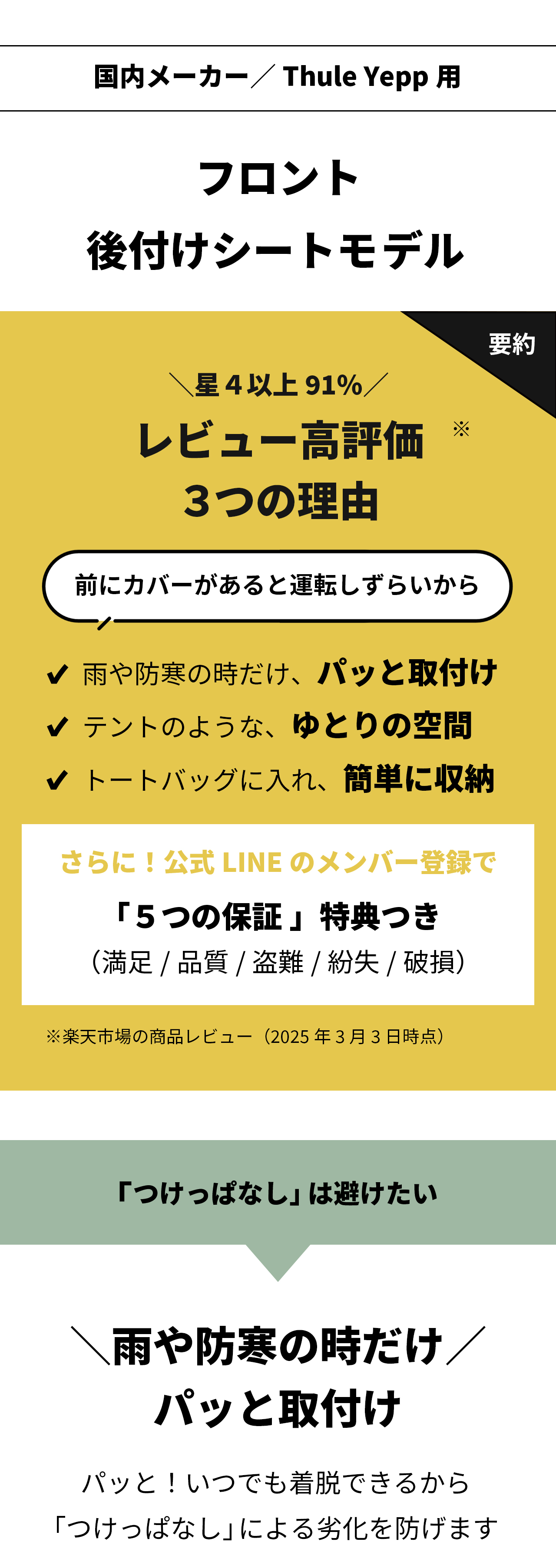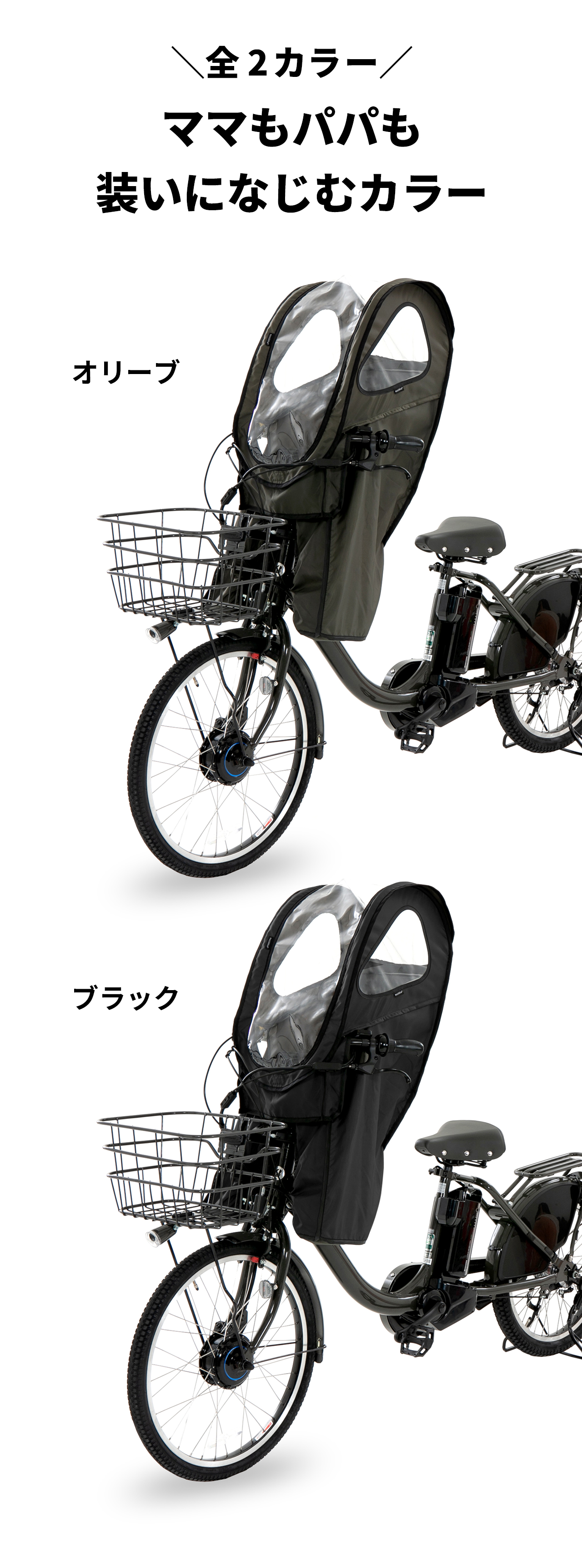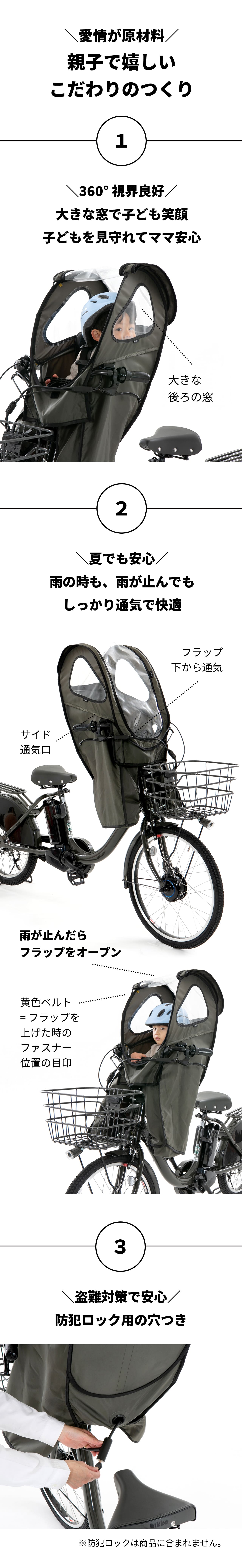 | ■着脱自在■自転車 ヘッドレスト付き フロント ( 前 )子供乗せ チャイルドシートに専用ヒネリ留具を取り付ければ、ワンタッチでパッとレインカバーを雨の日だけ装着できるのでおすすめです。留具は 自転車の子供乗せ チャイルドシートにつけっぱなしにします。レインカバーは着脱自在なので、子供乗せ 自転車につけっぱなしにしておく必要がなく、劣化を防ぐことができます。また猛暑日や晴天/強風時に子供乗せ 自転車の子供乗せ チャイルドシートから外せるので快適/安全です。レインカバーは取り外し簡単なので折り畳んで専用バッグで収納することもできる点も人気です。■広々空間■レインカバーはテントのような広々とした空間なため、フロントシート ( 前 )にお座りのお子様にとって快適に子供乗せ 自転車にお乗りいただけます。■快適空間■自転車の子供乗せ チャイルドシートに取り付けられたレイン カバーは、前窓を開けることができるため、雨上がりにチャイルドシート内への通気ができます。レインカバーのフラップ下とサイドに設けられた通気口は、自転車の走行中は空気が流れます。加えてレインカバーの側面にも窓があるので、フロント ( 前 )シートにお座りのお子様にとって自転車から見える景色を楽しめます。■雨対策■自転車の子供乗せ チャイルドシートからスムーズに乗り降りできます。またレインカバーの生地には撥水加工がされており、子供乗せ チャイルドシートへの雨の侵入を防ぎます(完全防水ではありません)。■安全対策■レインカバーにロック取付用リングがついているので、子供乗せ 自転車からレインカバーが盗難されにくい仕様となります。 |