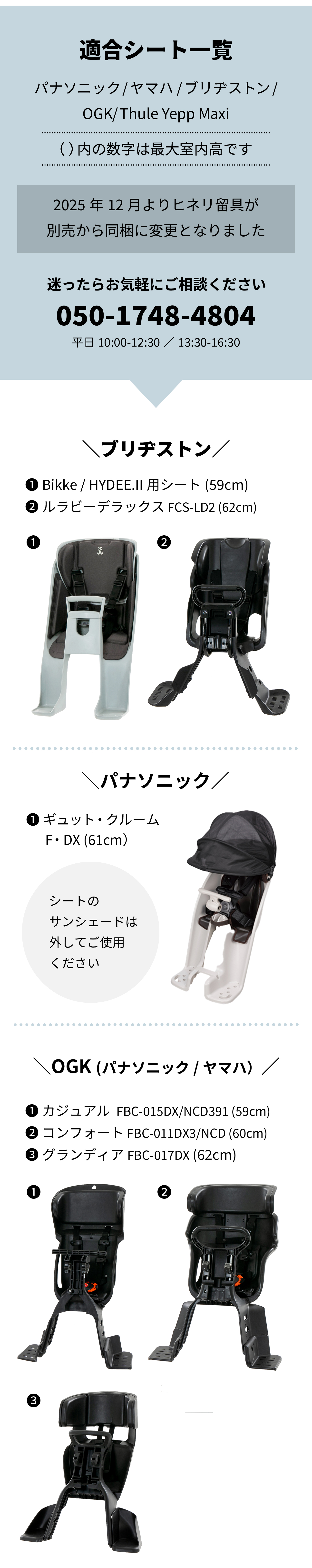 | 自転車 ヘッドレスト付き フロント 前 前用 子供乗せ チャイルドシートの内、下記のモデルに適合します。ただし一部のチャイルドシートは別途、留具が必要な場合があります。詳しくは上記のウェブサイト本文を必ずご参照ください。 ■ Thule スーリー / Yepp イェップ ■【1】 Thule Yepp Mini 【2】 Thule Yepp Nexxt Mini ■ OGK ( パナソニック / ヤマハ ) ■【1】 カジュアル FBC-015DX/NCD470/391 【2】 コンフォート FBC-011DX3/NCD467/336ほか【3】 グランディア FBC-017DX FBC-017DX2 ■ ブリヂストン ■【1】 bikke / ビッケ 、HYDEE.II / ハイディー II【2】 ルラビーデラックス FCS-LD2 |