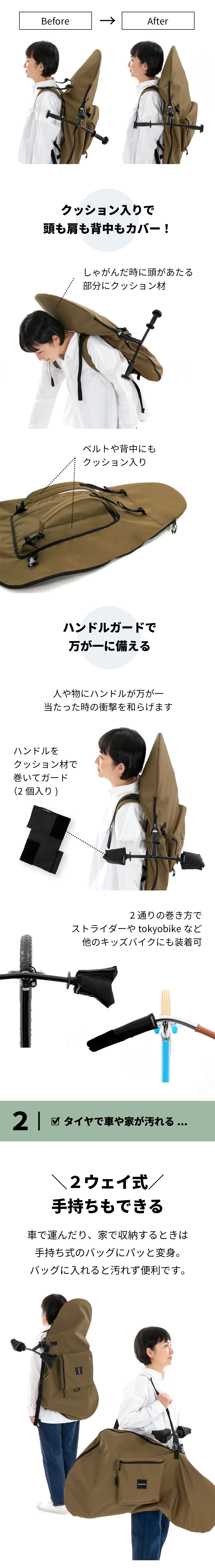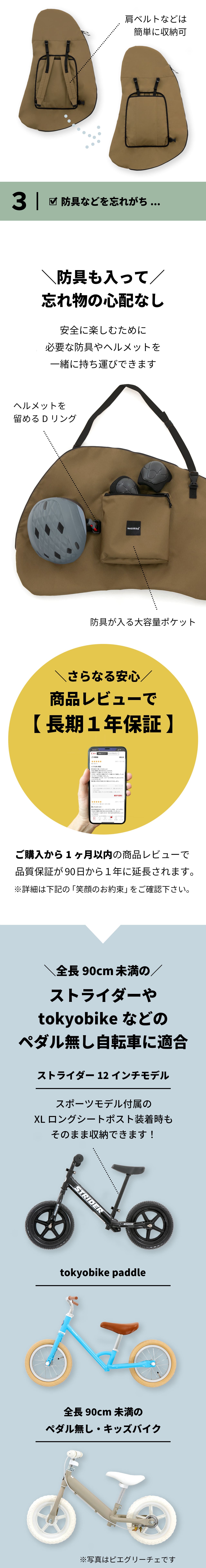 | ■軽がる持ち運び■ ストライダー トーキョーバイク ( tokyobike ) や キッズバイク ( ペダル無し自転車 ) を背負うことで軽がる 持ち運び ( 収納 )ができる ストライダー バッグ ( キャリーバッグ・ストライダーケース ) です。独自機構で背中に密着させることで、さらに軽く感じます。さらに クッション材が頭 背中 など体に当たる部分をカバーし、肩ベルトを引っ張ることでより安定できるため、重たいキックバイクの移動も軽々です。 ストライダー などを屋外ではリュックのように快適に背負うことができます。2WAYバッグなので、ショルダーバックのように肩掛けのキャリーバッグとして持ち歩きすることもできます。 ■たっぷり収納■ヘルメット や プロテクター も一緒に 収納 して、持ち運び ができます。忘れ物もなく手ぶらで、安心・楽々。 ■汚れず快適■家や車(屋内・車内)もキャリーバッグ に 収納・保管 しておけば、汚れる心配がありません。持ち運び するときも ストライダー のタイヤが直接、体に当たることがないので洋服も汚れずに持ち運ぶことができます。 |