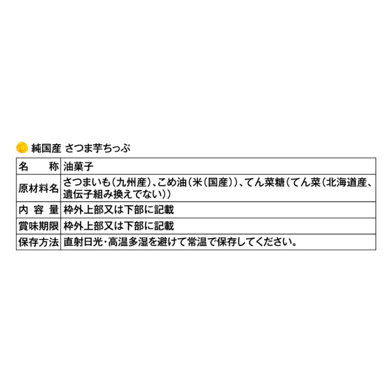 ■ 原材料さつまいも(九州産)、こめ油(米(国産))、てん菜糖(てん菜(北海道産、遺伝子組換えでない))