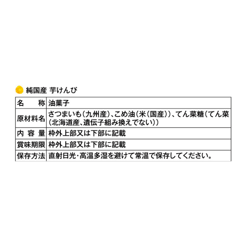 ■ 原材料さつまいも(九州産)、こめ油(米(国産))、てん菜糖(てん菜(北海道産、遺伝子組換えでない))