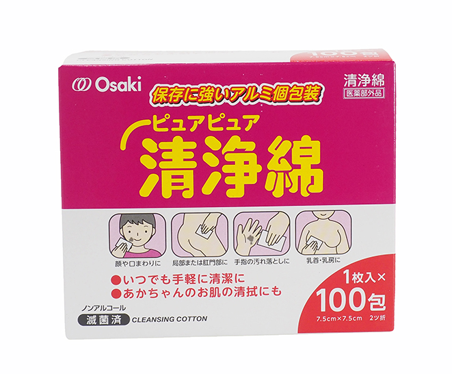 赤ちゃんにも使える。お肌の清浄にお勧め! ピュアピュア清浄綿 100枚入り アルミ個包装