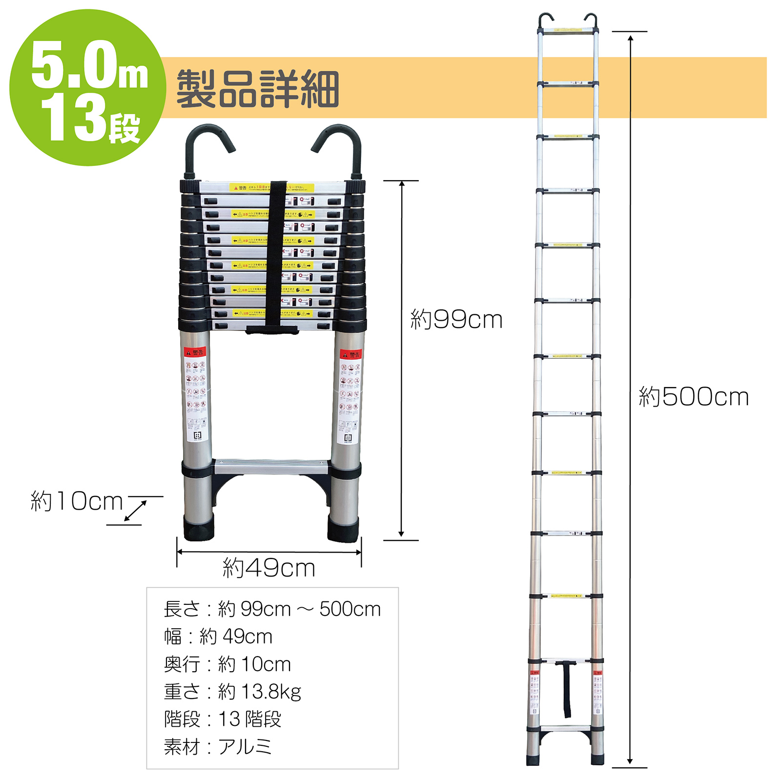 伸縮はしご 梯子 はしご 5m 伸縮 アルミ ハシゴ フック付き スライド式 屋根用 折りたたみ 耐荷重150kg