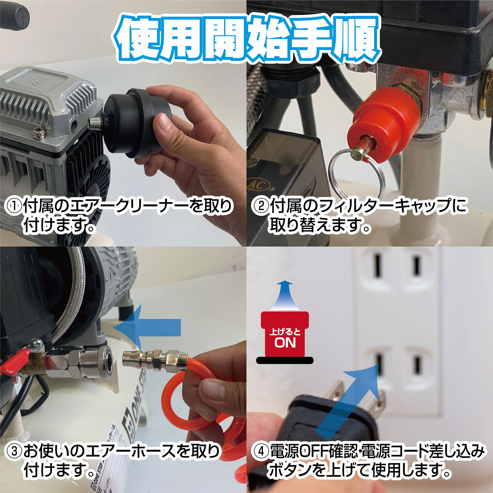また、オイルレスのエアーコンプレッサーなので、メンテナンスも簡単です。