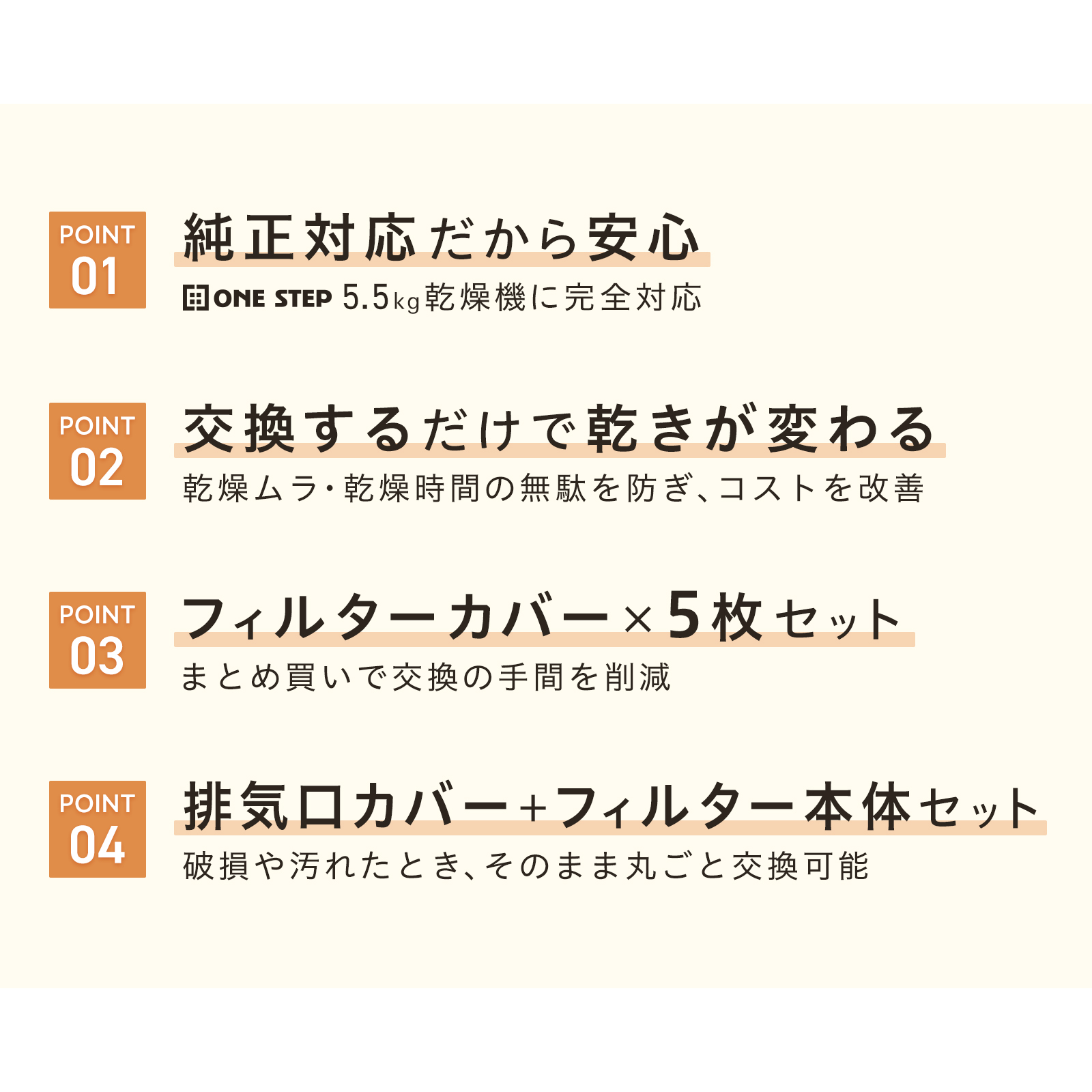 本製品はONE STEP 5.5kg乾燥機に完全対応しており、純正互換で安心。