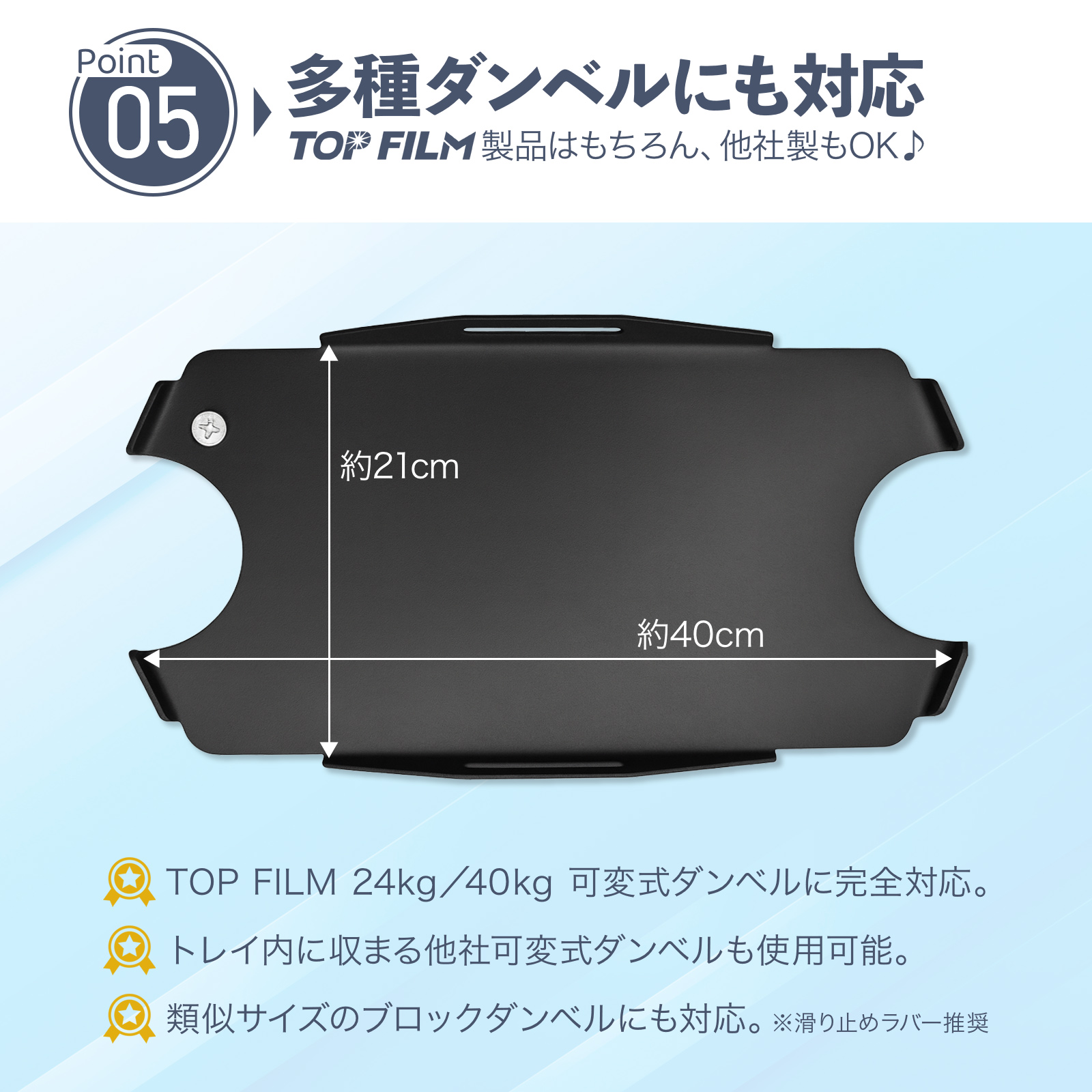 TOP FILM製はもちろん、他社の可変式やブロックダンベルにも対応(※滑り止めマット併用推奨)。