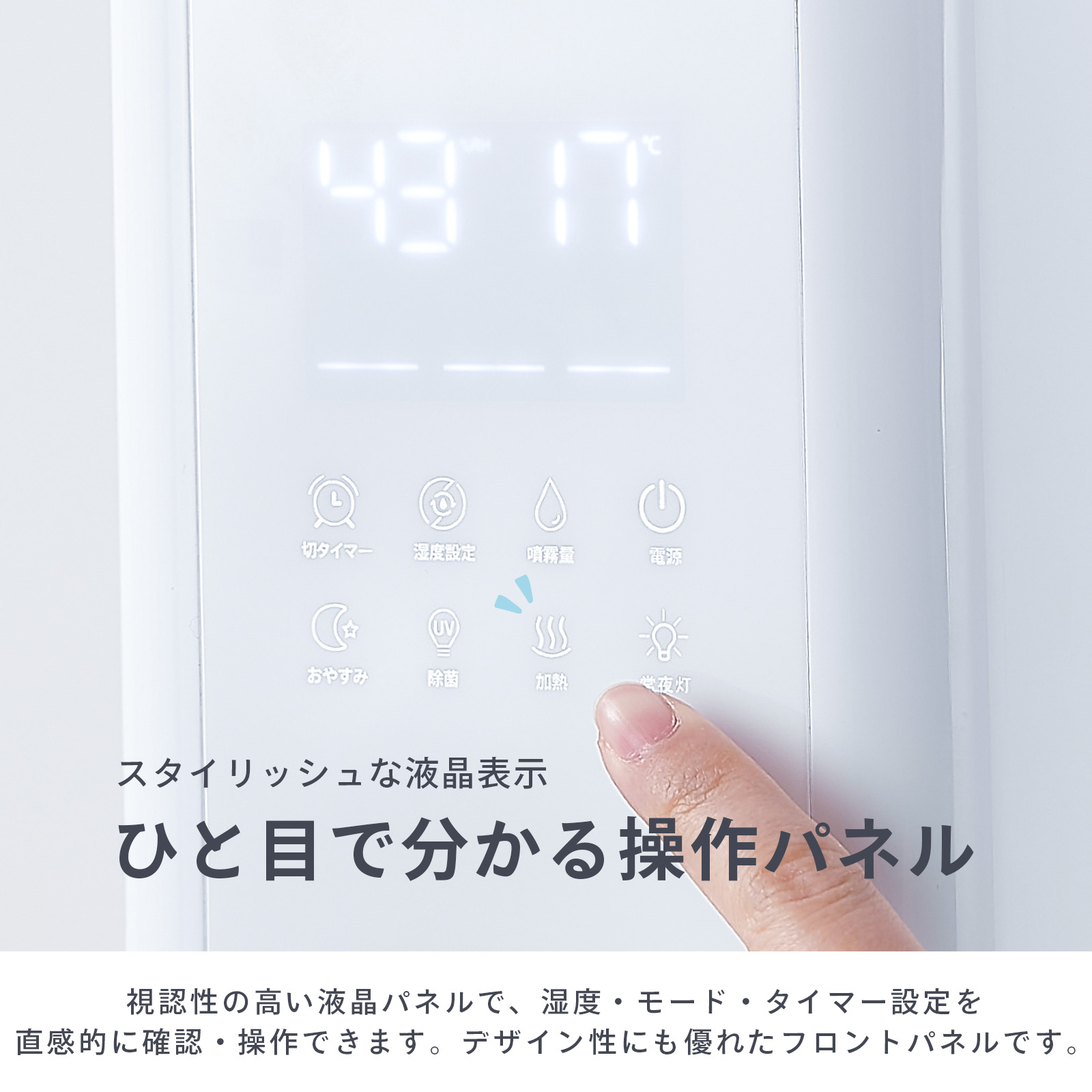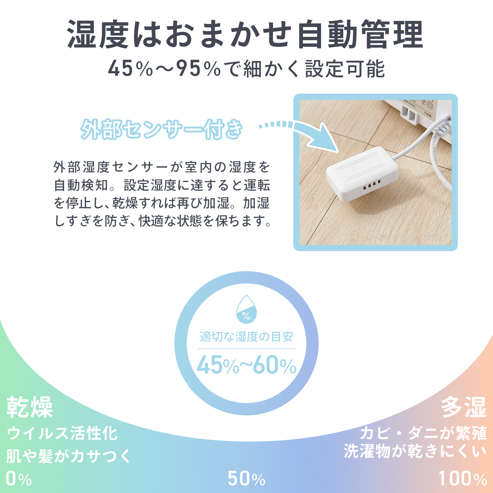 湿度は45%〜95%まで細かく設定でき、自動停止と再稼働で快適な湿度をキープ。