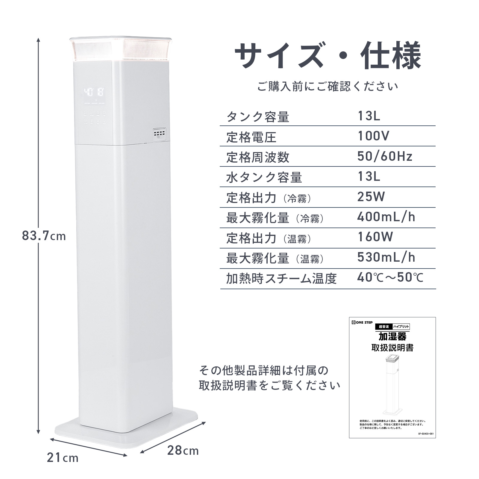 ハイブリッド 加湿器 スチーム式 超音波式 大容量 上から給水 タワー型 uv除菌 マイナスイオン 気化式 加熱式 13L