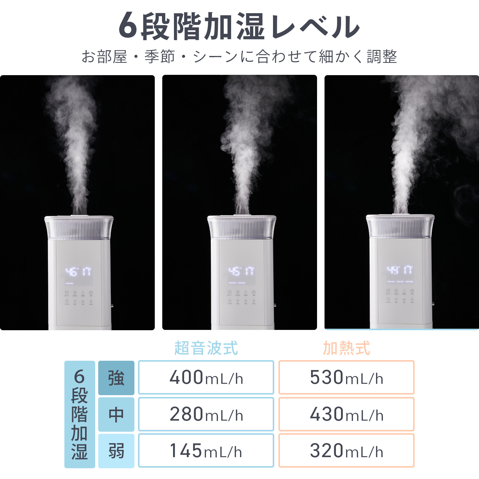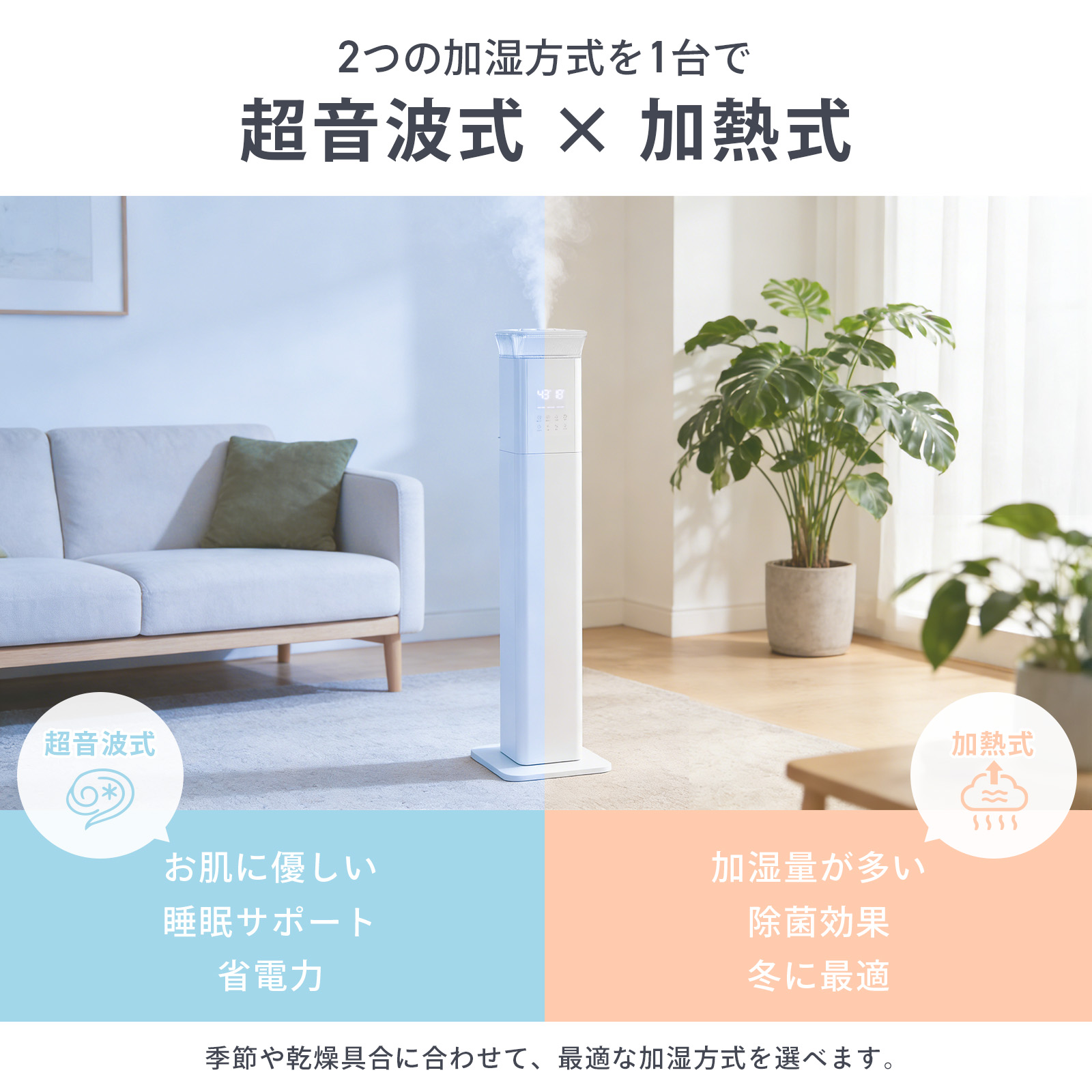 シーンに合わせて超音波式と加熱モードを切り替えられ、加熱時には除菌しながらきれいなミストをお部屋に届けます。